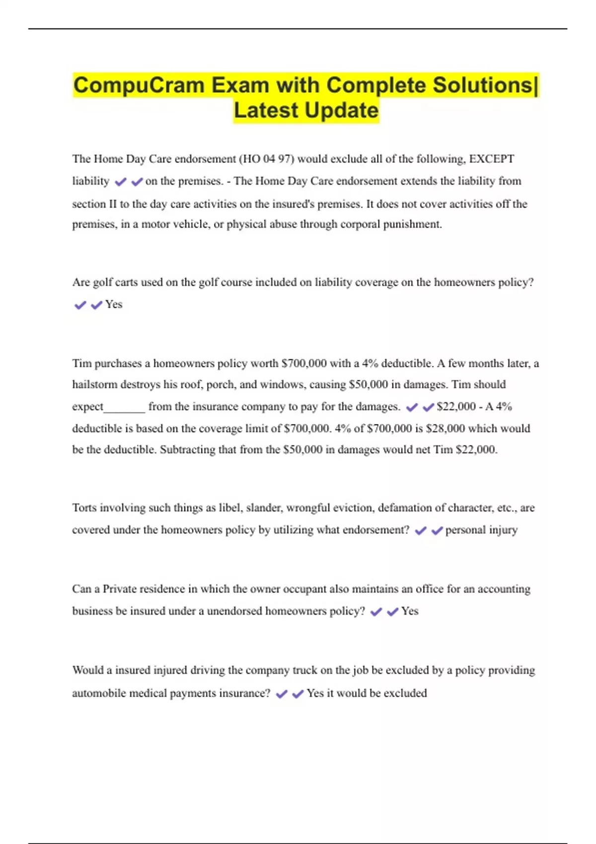 Compucram PROPERTY INSURANCE & WARRANTIES- Questions and Answers 8 Exam (elaborations) CompuCram Real Estate Questions and Answers| Latest Update 9 Exam (elaborations) CompuCram Real Estate Sales- National + Ohio Questions and Answers| Latest Update 10 Exam (elaborations) CompuCram Simulated Exam #1 with Verified Solutions| Latest Update 11 Exam (e