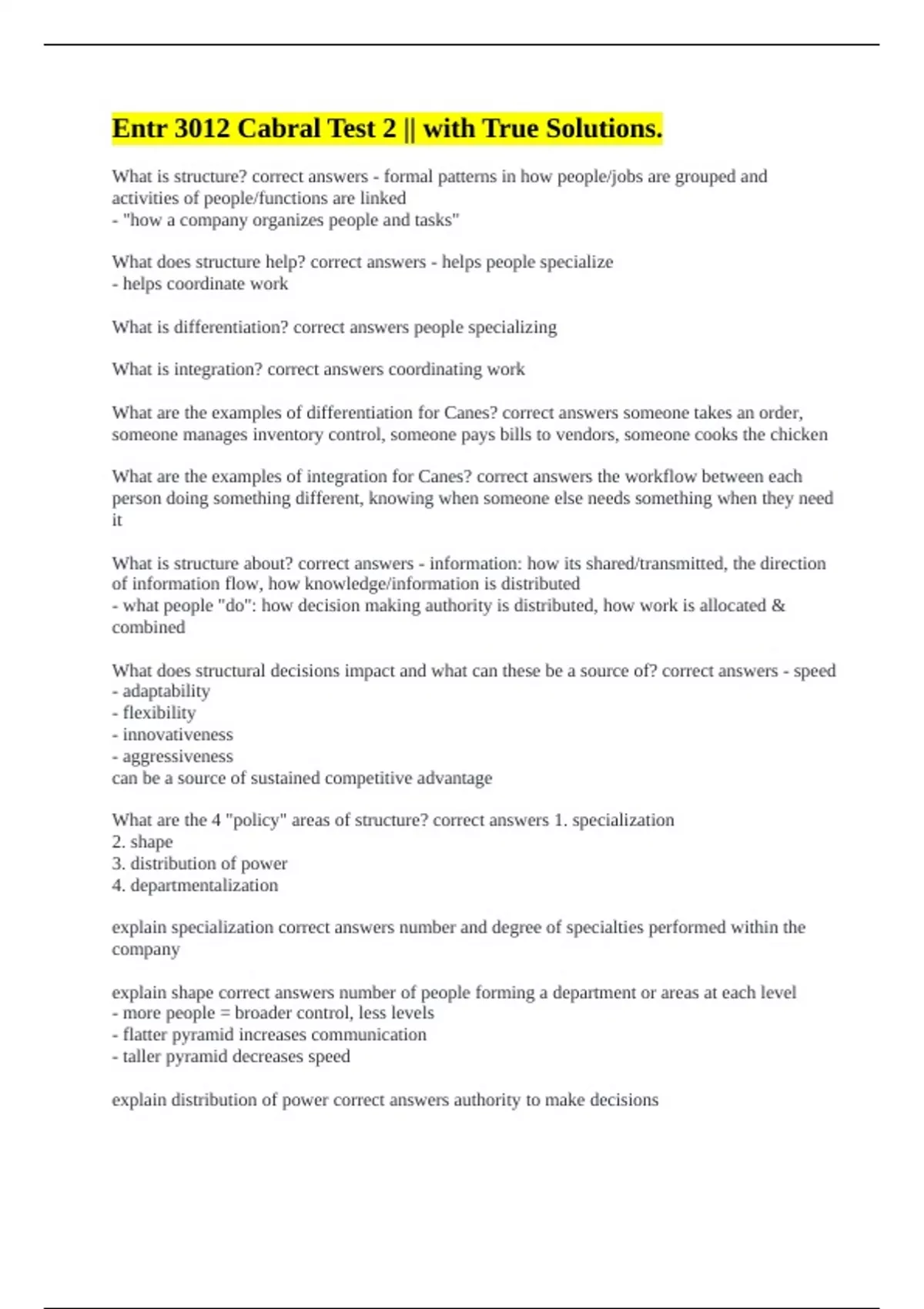 ENTR 3012 Test 2 || All Correct. ENTR 3012 Test 2 || with Faultless Solutions. Entr 3012 Cabral Test 2 || with True Solutions. ENTR 3012 EXAM 1 || WITH 100% CORRECT ANSWERS. ENTR 3012 Exam 1 || with 100% Errorless Answers. ENTR 3012 Intrapreneurship Test 1 (Cabral) || A Verified A+ Pass.