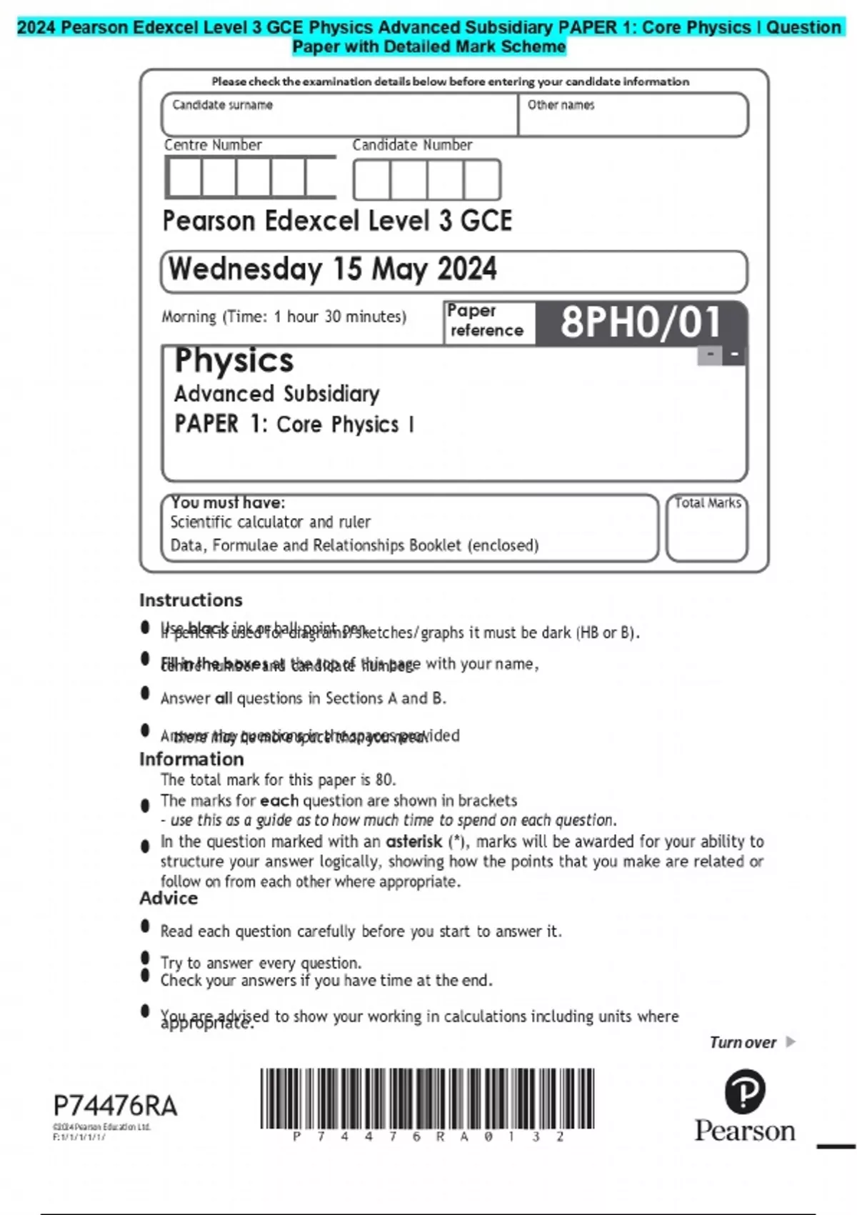 Candidate surname Other names 2024 Pearson Edexcel Level 3 GCE Physics Advanced Subsidiary Question Paper with Detailed Mark Scheme