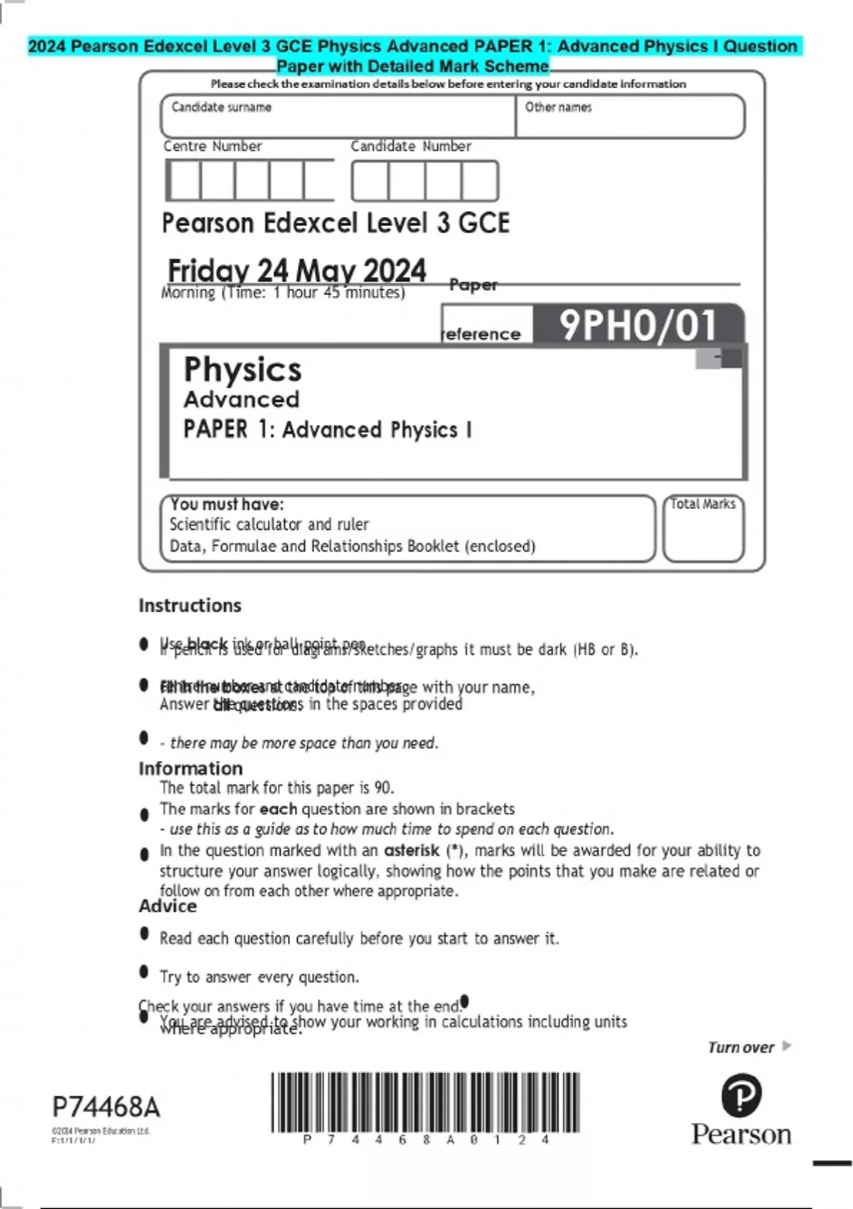Bundle 2024 Pearson Edexcel Level 3 GCE Physics Advanced PAPER 1: Advanced Physics I Question Paper with Detailed Mark Scheme