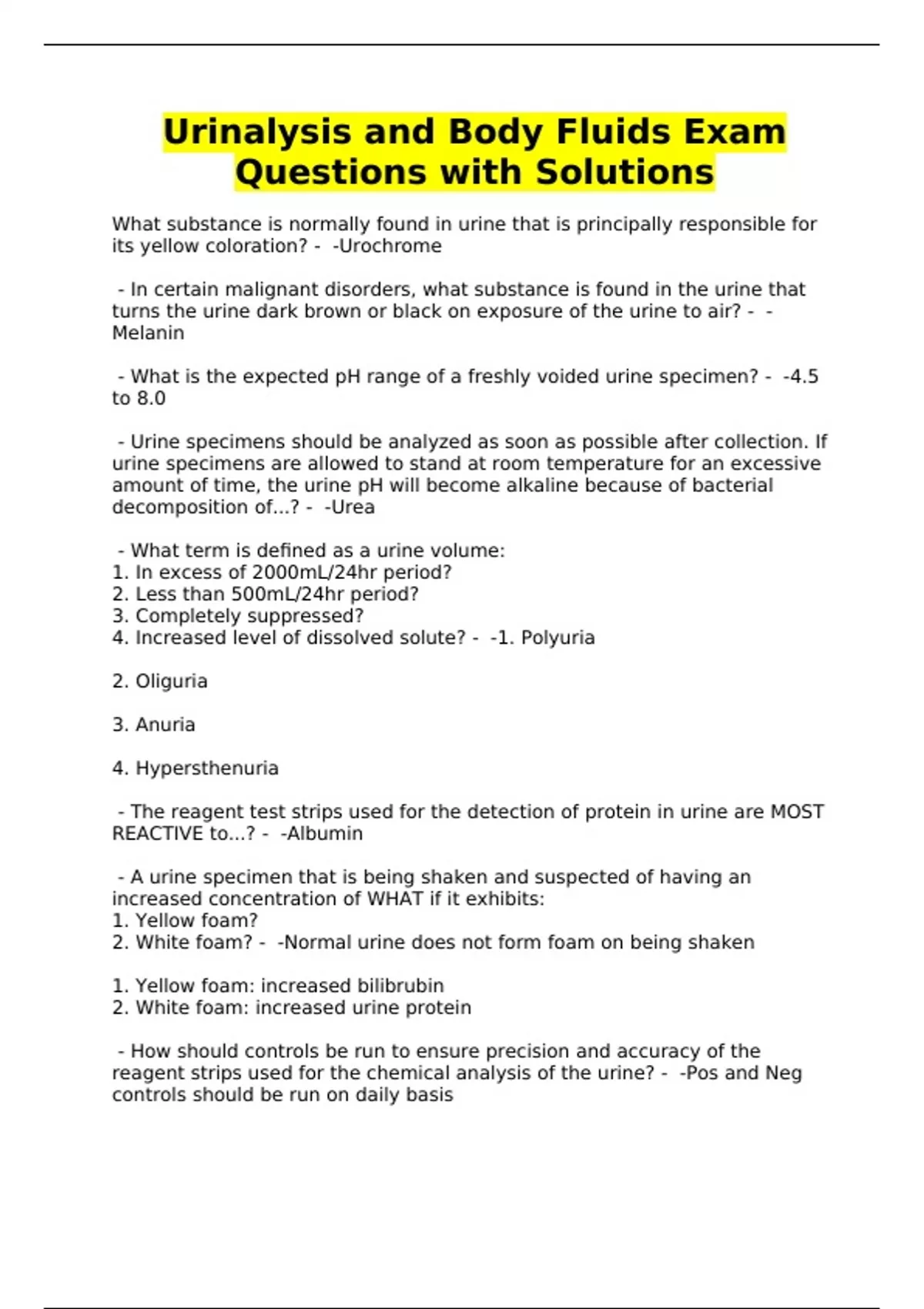 Urinalysis and Body Fluids Exam Questions with Solutions