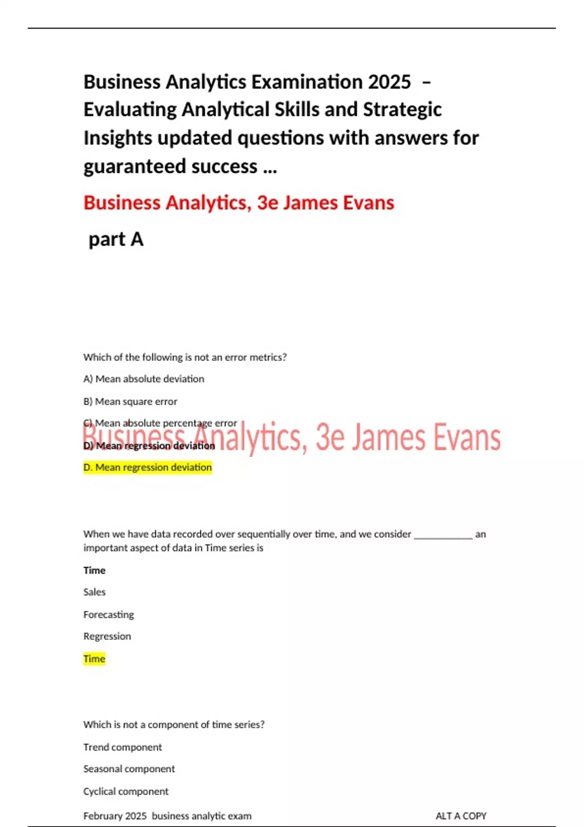 Comprehensive Business Analytics exams covering key concepts from Business Analytics, 3rd Edition by James Evans. Includes multiple-choice, short-answer, and case-based questions to test knowledge in data analysis, predictive modeling, and decision-making. Perfect for exam prep and study revision