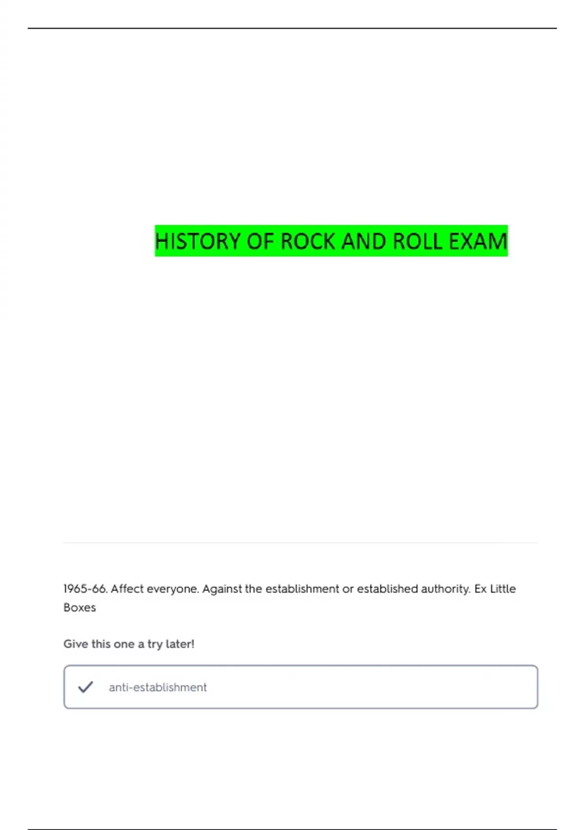HISTORY OF ROCK AND ROLL EXAMS ALL WITH CORRECT ANSWERS