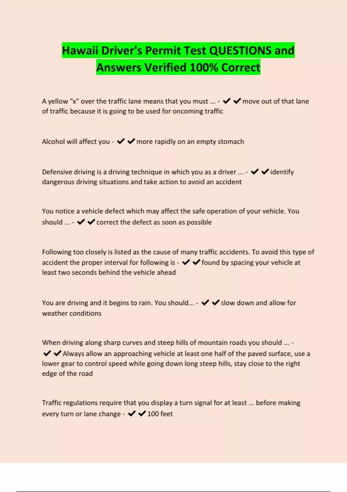 Hawaii Drivers Permit Exam Questions with Correct Solutions