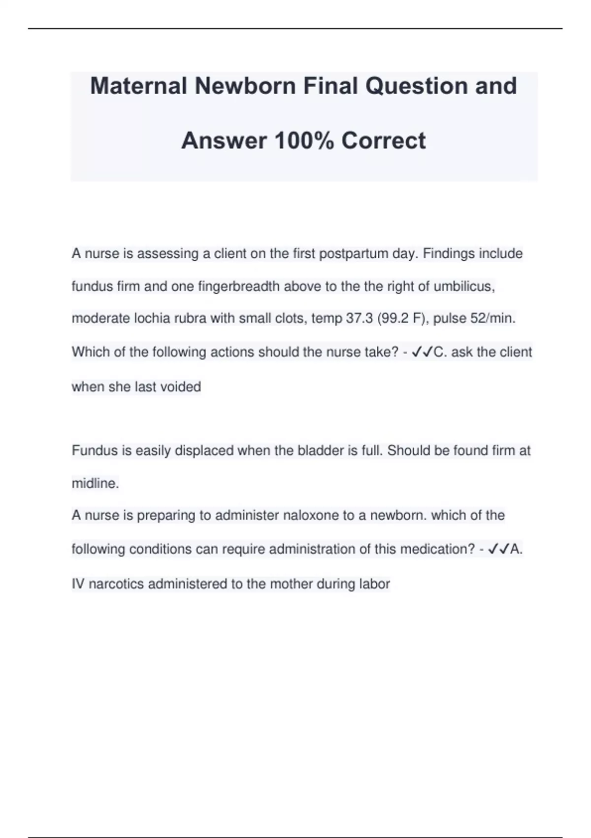 Maternal Newborn Final Question and Answer 100% Correct