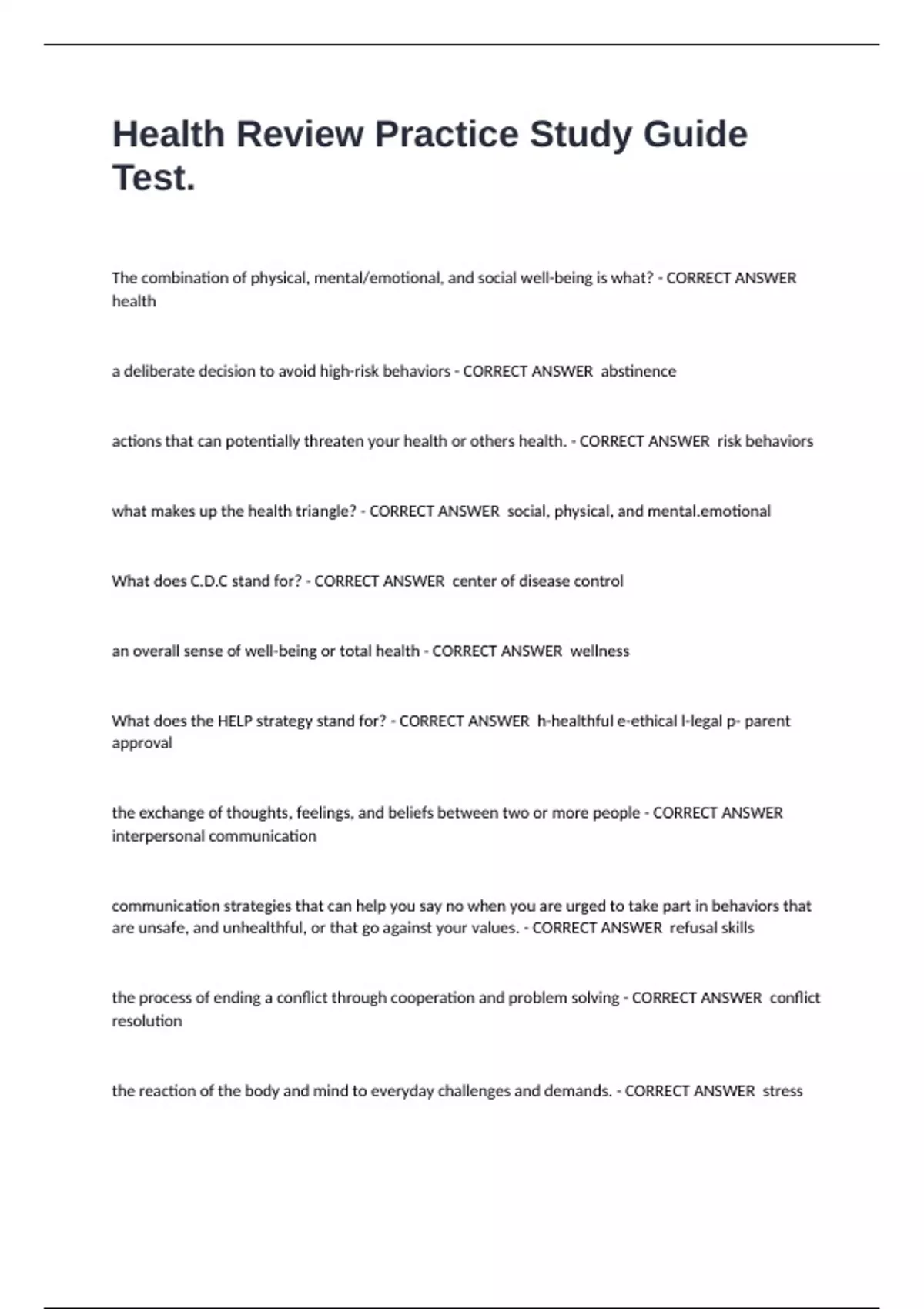 Exam (elaborations) Freshman Health Exam Questions & Answers. Exam (elaborations) APEX HEALTH FINAL EXAM QUESTIONS AND ANSWERS. Exam (elaborations) Online Health, Final Exam Study Test. Exam (elaborations) Year 10 Health Study Exam Revision Test. Exam (elaborations) COPE Health Scholars Written Exam Questions with 100% Correct Answers. E