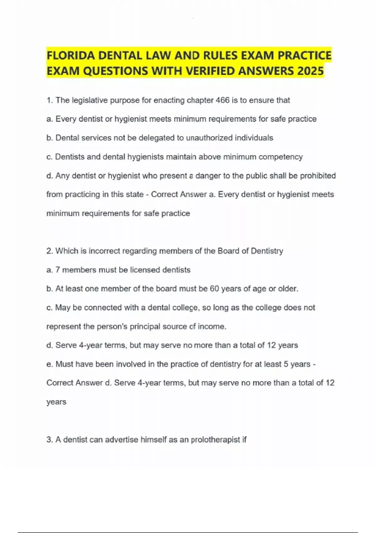Florida Dental Laws and Rules Latest Questions And Answers 2025 FLORIDA DENTAL LAW AND RULES EXAM PRACTICE EXAM QUESTIONS WITH VERIFIED ANSWERS 2025