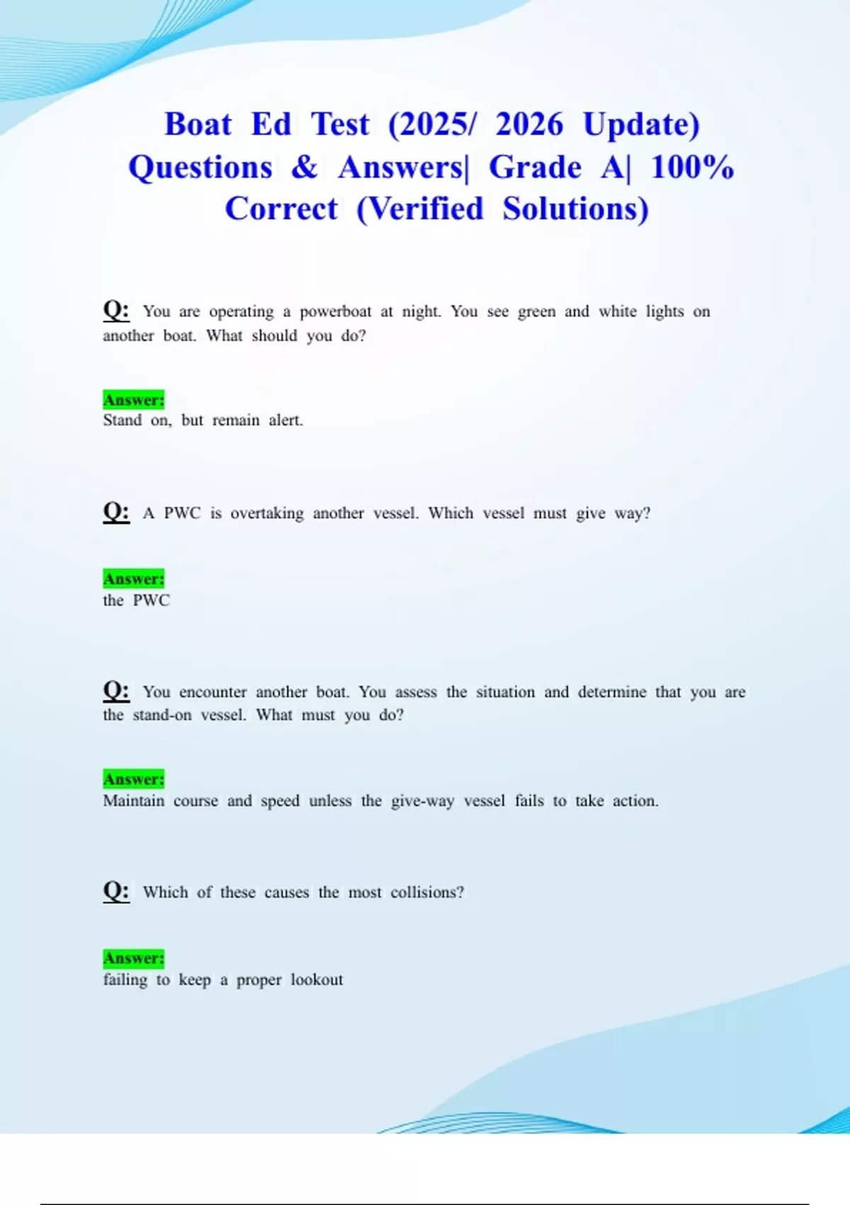 Boat Ed Temporary Boaters/ Boat Ed Test (Latest 2025/ 2026 Updates STUDY BUNDLE PACKAGE WITH SOLUTIONS) Questions & Answers| Grade A| 100% Correct (Verified Solutions)