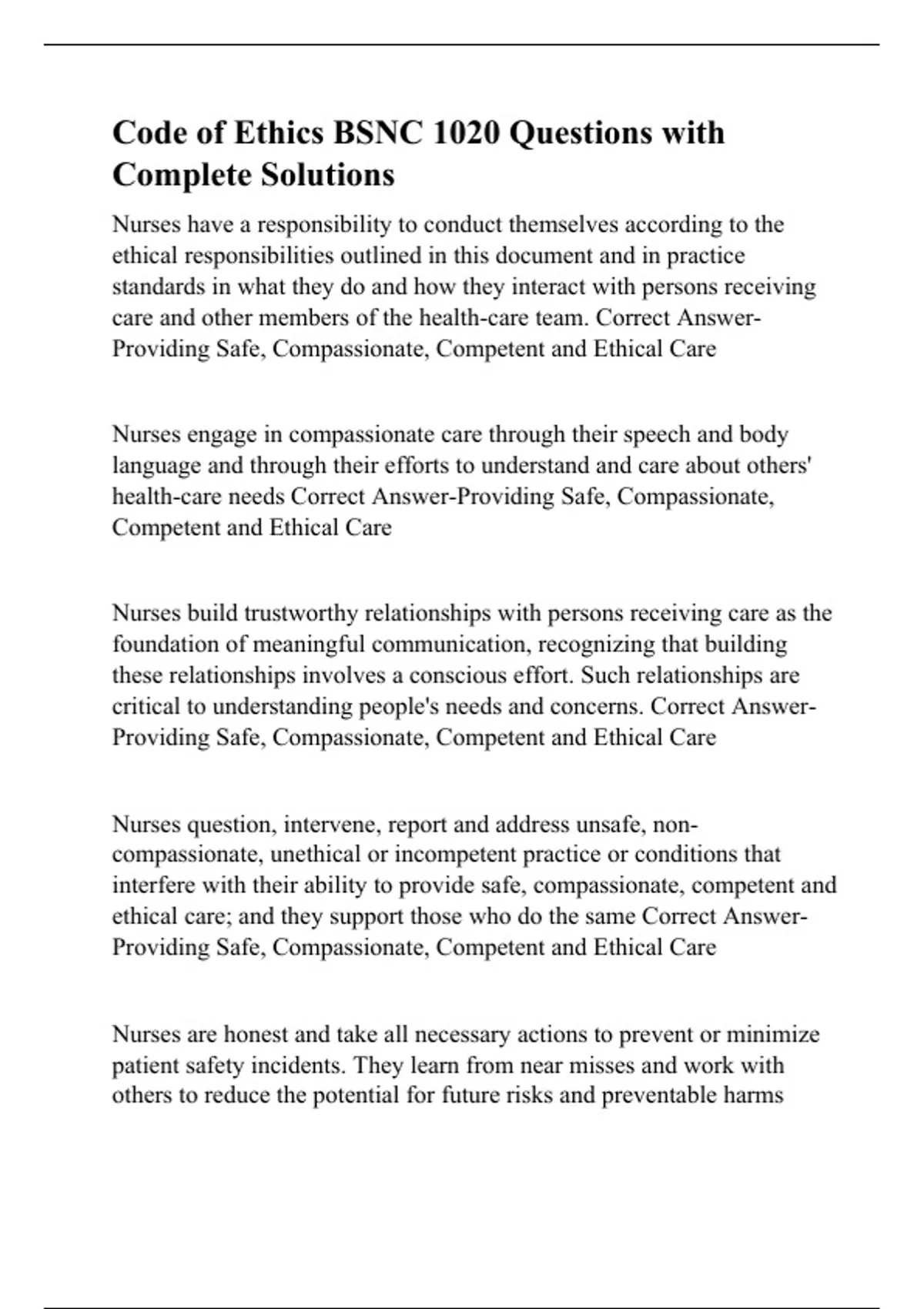 Code of Ethics BSNC 1020 Questions with Complete Solutions