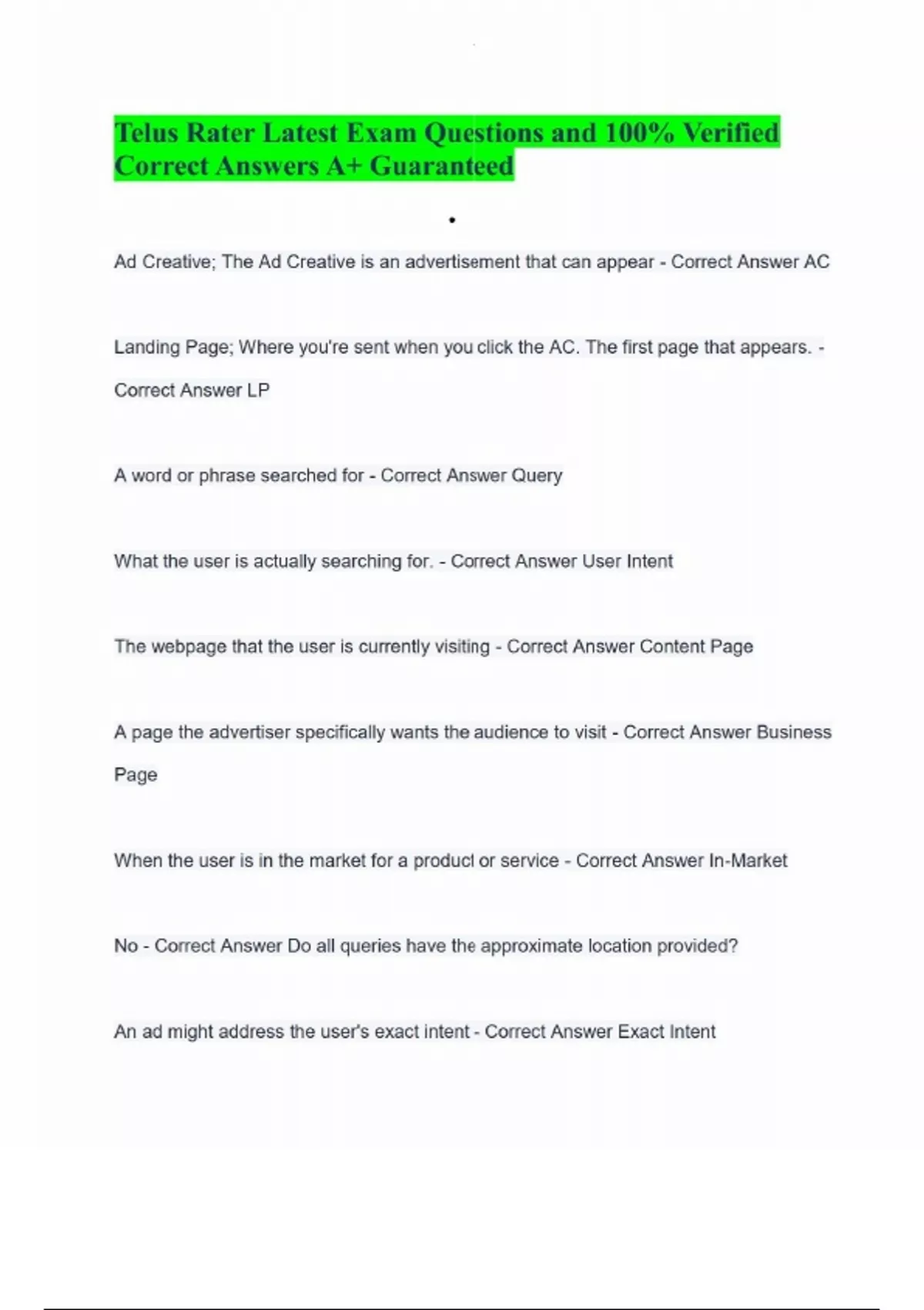 Telus Rater Exam Questions With verified Answers 2025 Telus Exam 1 2024 Questions & Verified Answers | 100% Correct | 2025