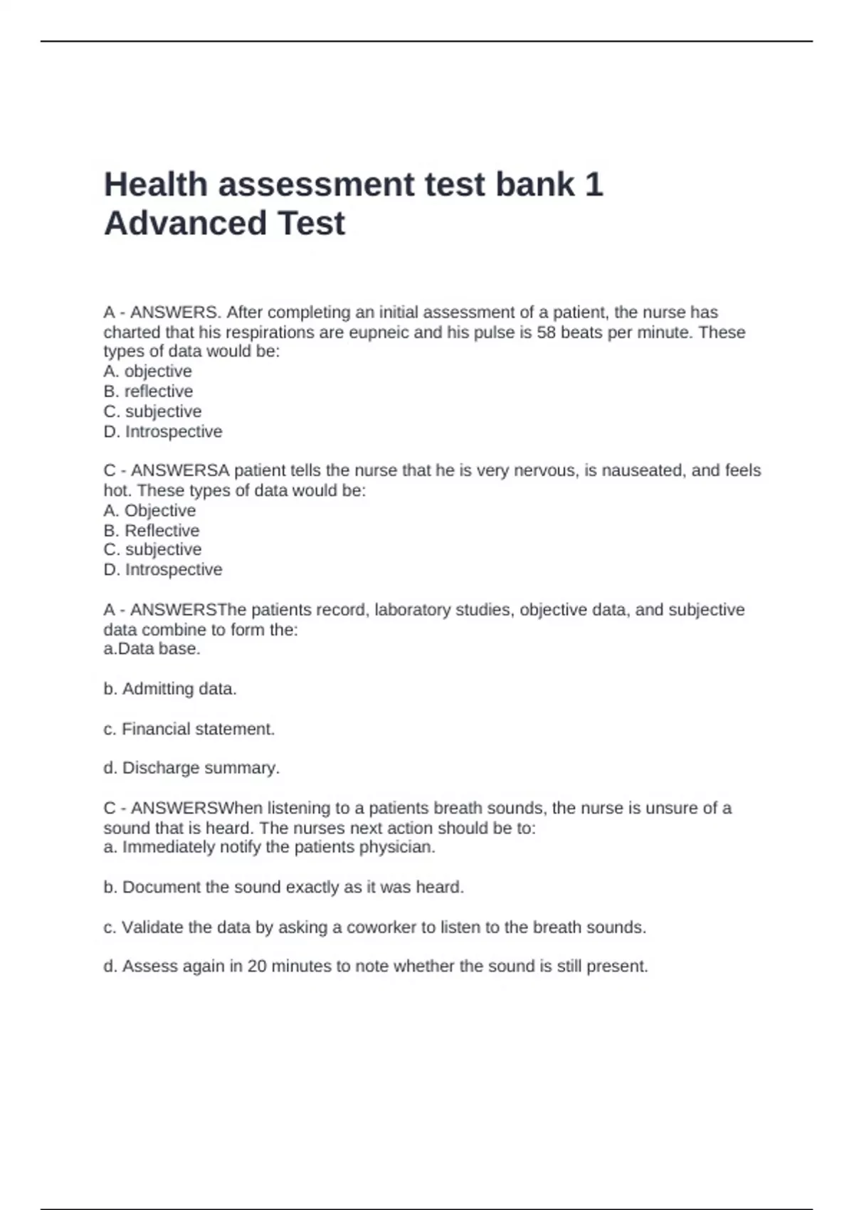 Exam (elaborations) Health assessment test bank 1 Advanced Test 2 Exam (elaborations) Gero: Toward healthy aging chapter 11 3 Exam (elaborations) Toward Healthy Aging, 11th Edition Chapter 15: Nutritional Health Advanced Test 4 Exam (elaborations) Chapter 01: Introduction to Healthy Aging (test bank) Study Guide
