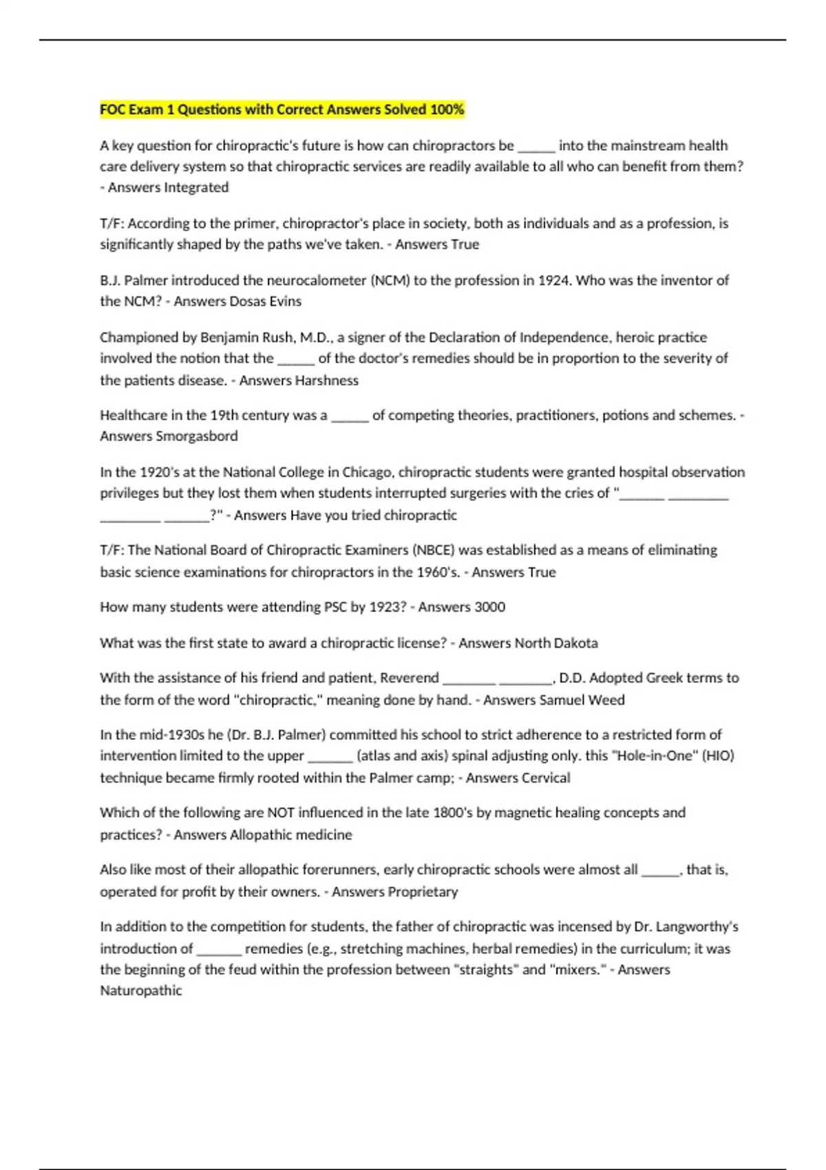 FOC Exam 1 Questions with Correct Answers Solved 100%