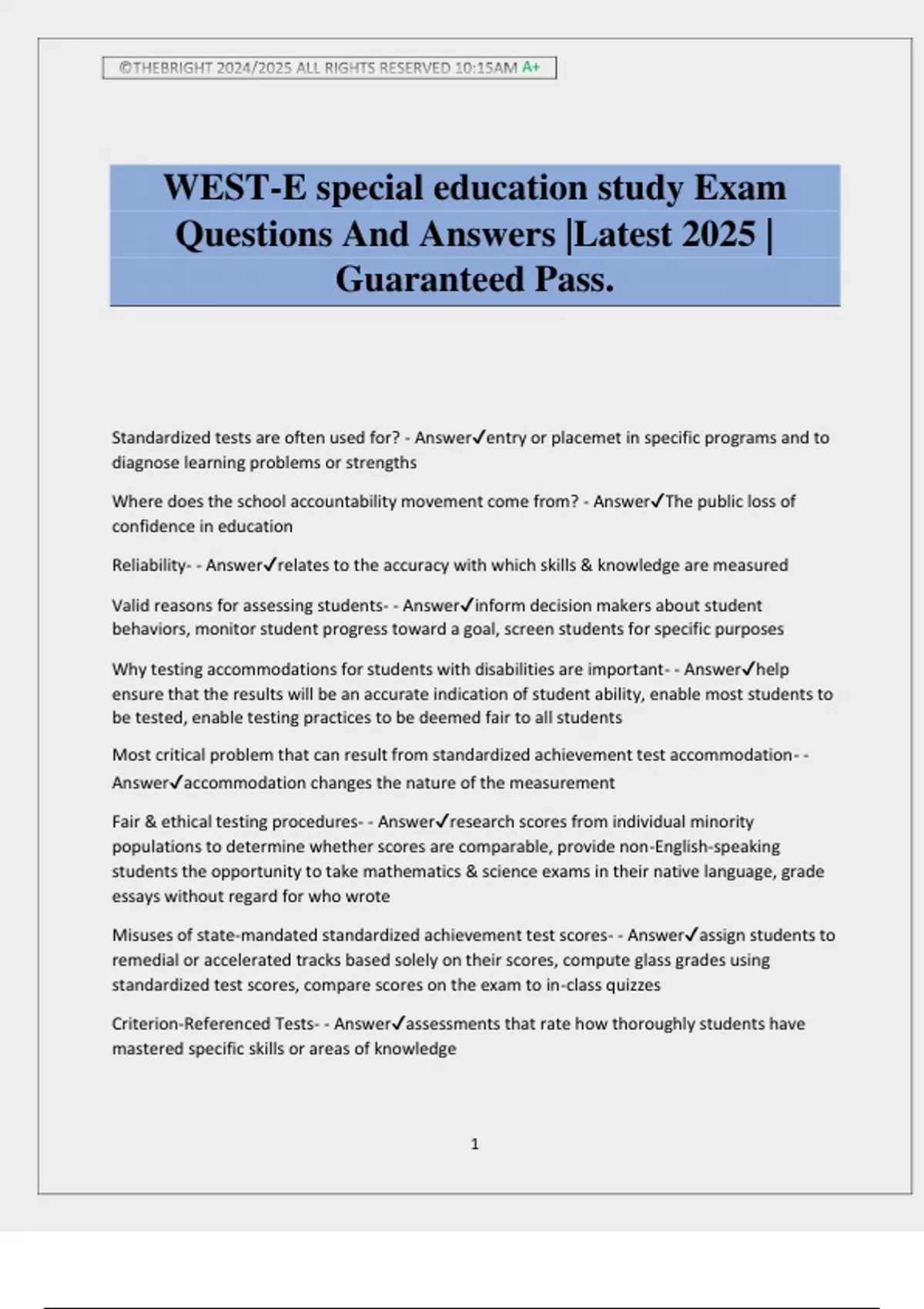 Assessment in Special Education Exam Questions And Answers |Latest 2025 | Guaranteed Pass.