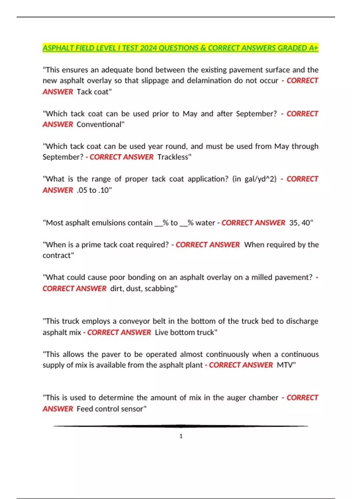 ASPHALT FIELD LEVEL I TEST 2024 QUESTIONS & CORRECT ANSWERS GRADED A+