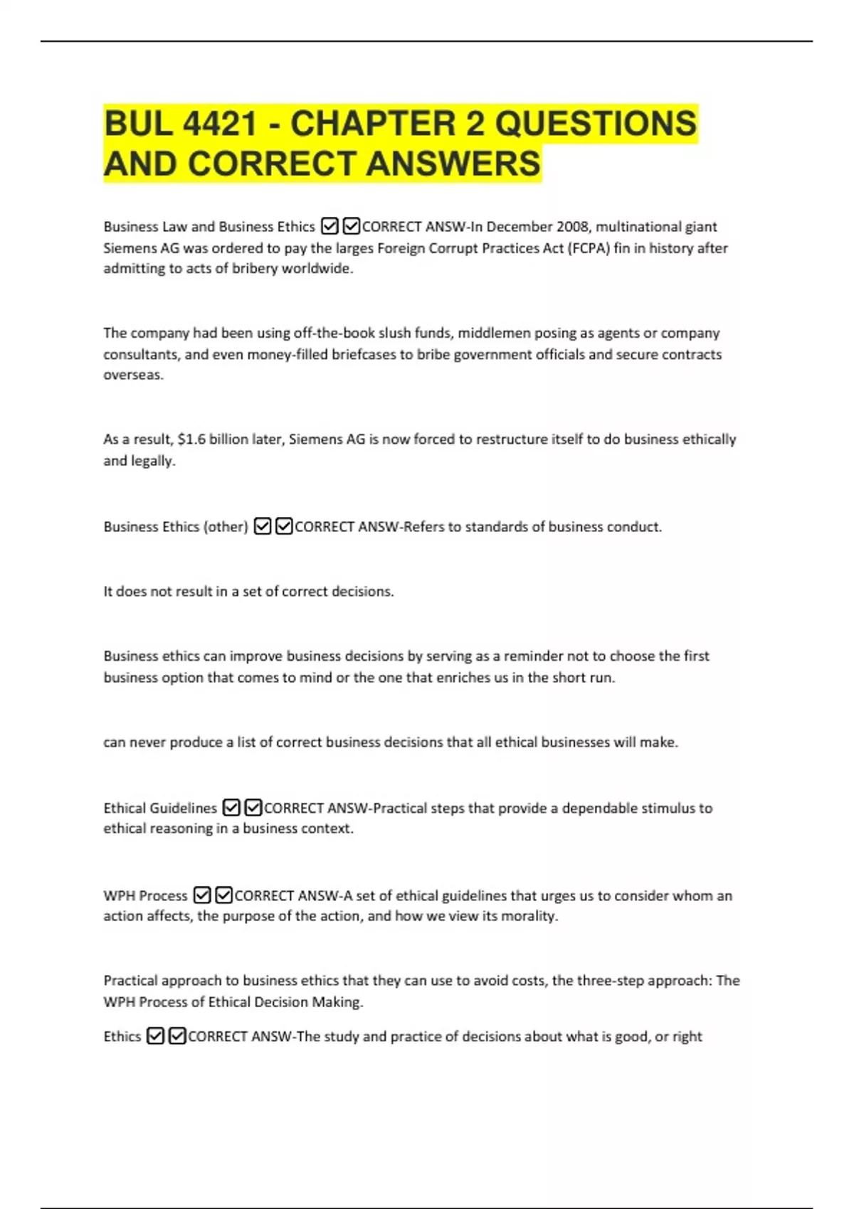 BUL 4421 - CHAPTER 2 QUESTIONS AND CORRECT ANSWERS 2 Exam (elaborations) BUL 4421 CHAPTER 1 QUESTIONS AND CORRECT ANSWERS 3 Exam (elaborations) BUL 4421 FINAL - FAU GENDLER QUESTIONS AND CORRECT ANSWERS 4 Exam (elaborations) BUL 4421-MIDTERM FAU GENDLER QUESTIONS AND CORRECT ANSWERS 5 Exam (elaborations) BUL 4421-001 ETHICS TEST QUESTIONS AND C