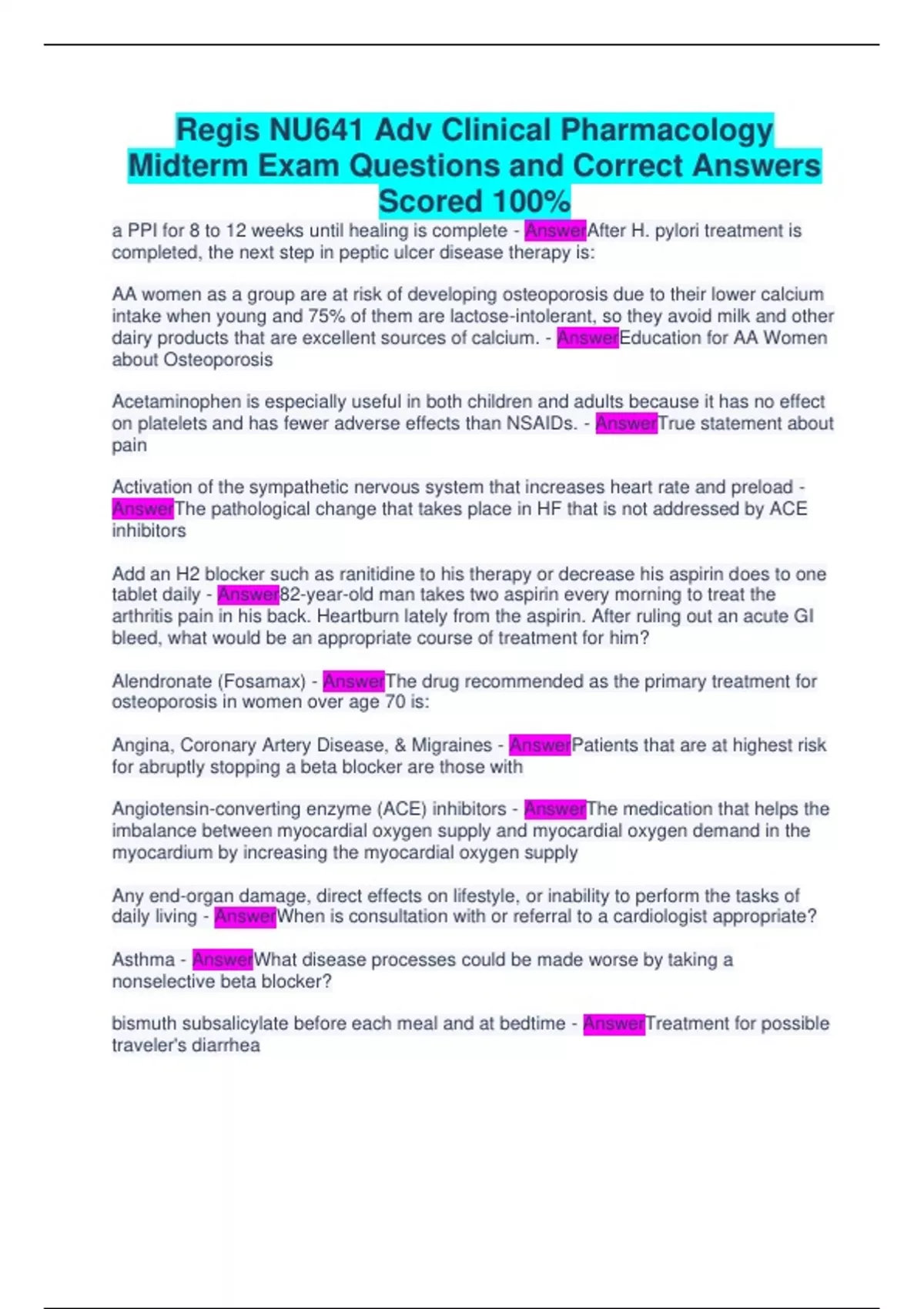 Regis NU641 Adv Clinical Pharmacology Midterm & Final Exam Questions and Correct Answers Scored 100%