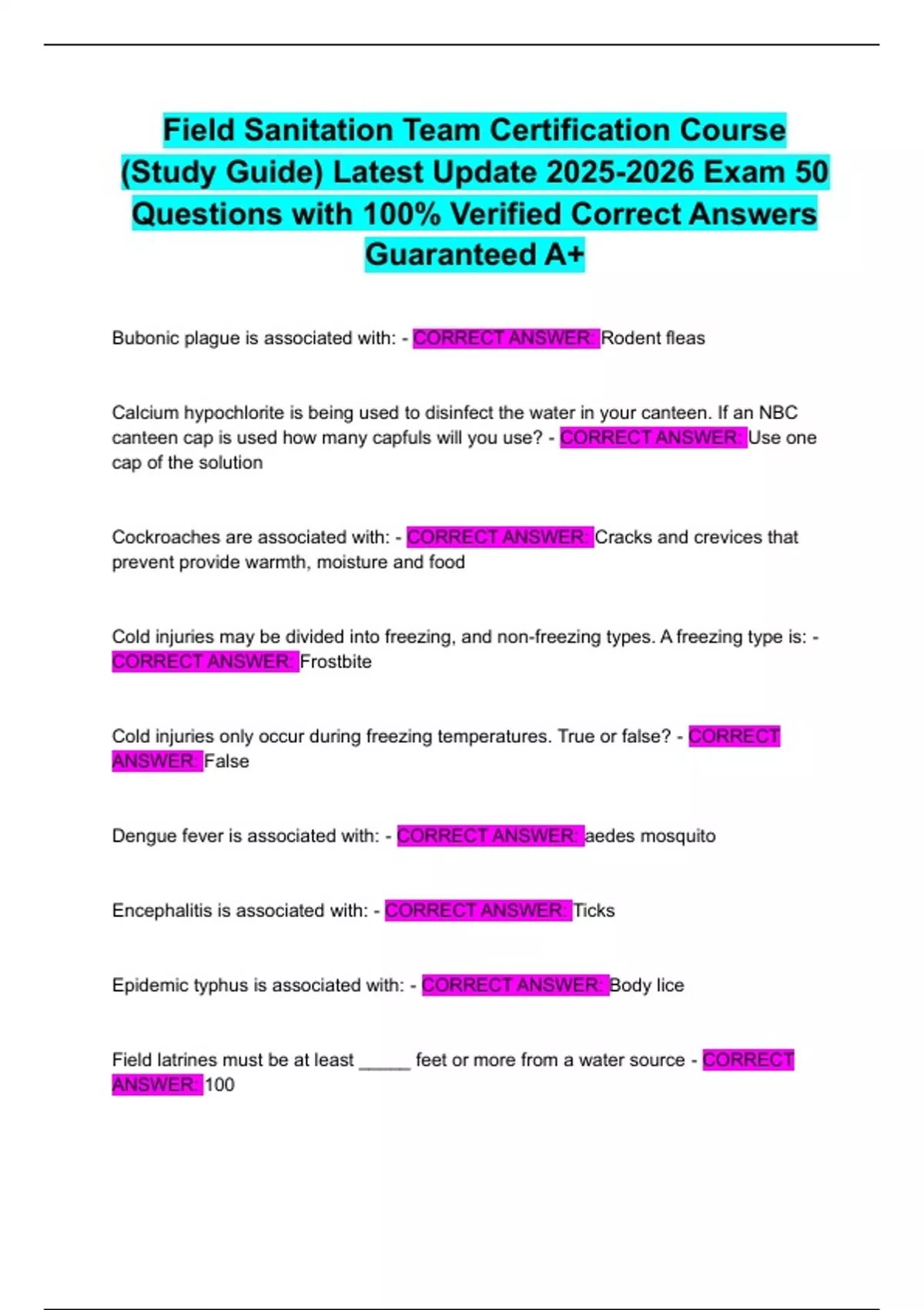 Field Sanitation Certification Course Latest Update Exam & Study Guide