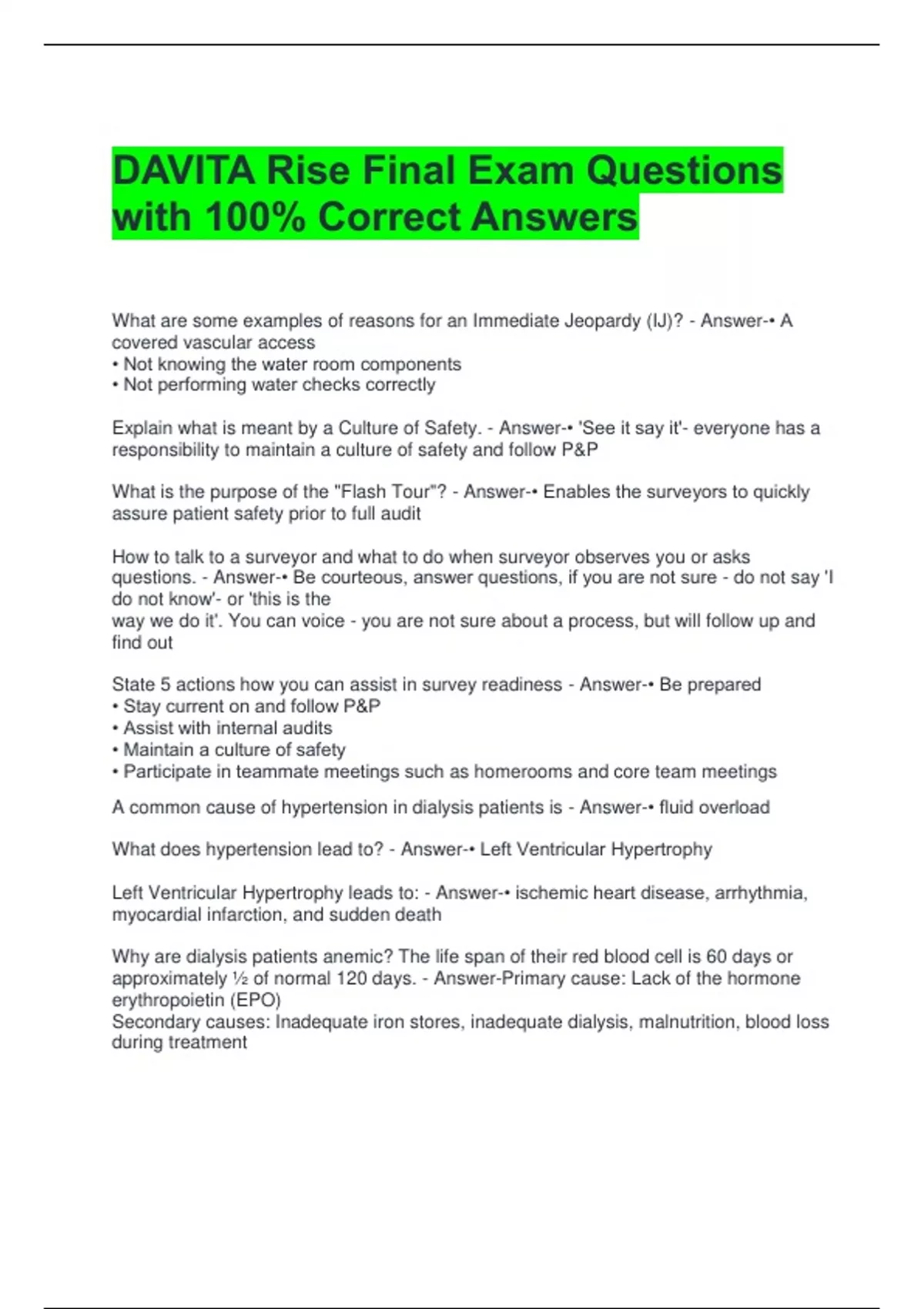 DAVITA Rise Final Exam Questions with 100% Correct Answers 2 Exam (elaborations) DAVITA Rise Test Questions and Answers All Correct 3 Exam (elaborations) DAVITA RISE Module 3 Questions with All Correct Answers 4 Exam (elaborations) DAVITA RISE Module 2 Questions and Answers All Correct 5 Exam (elaborations) DAVITA RISE Module Quiz Questions wit