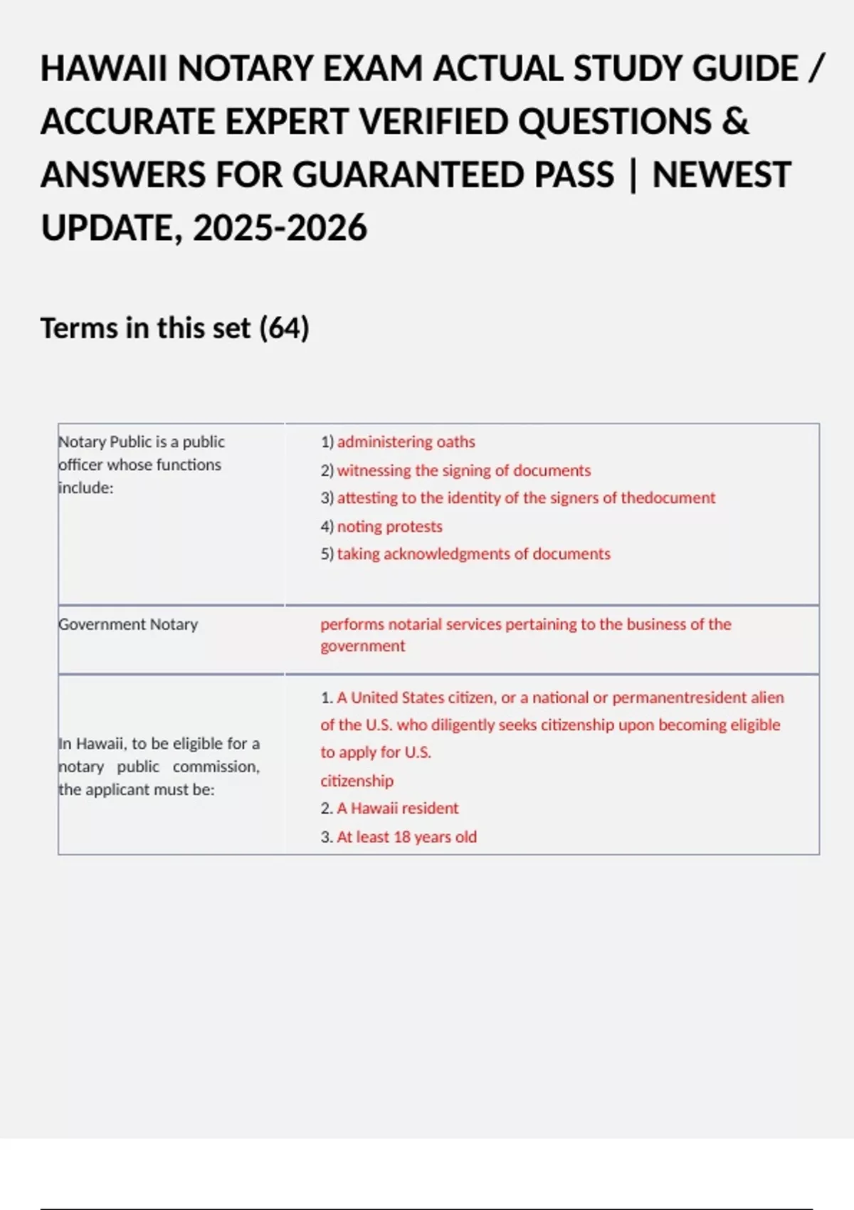 Exam (elaborations) HAWAII NOTARY EXAM ACTUAL STUDY GUIDE / ACCURATE EXPERT VERIFIED QUESTIONS & ANSWERS FOR GUARANTEED PASS | NEWEST UPDATE, 2 Exam (elaborations) Hawaii Notary Exam Questions Study Guide / Actual Questions and Answers (A+ Guide Solution) Newest 2025/2026