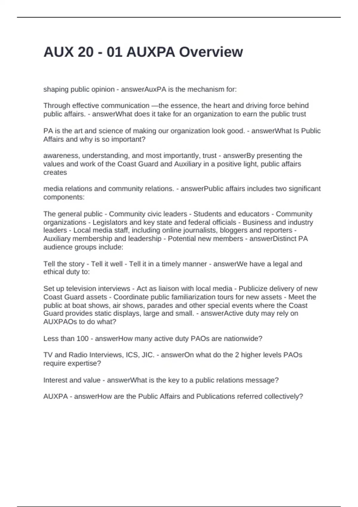 Exam (elaborations) USCG OPSEC Test out for Security Fundamentals Questions and Answers Graded A+ Exam (elaborations) USCG coxswain study guide questions and answers fully solved Exam (elaborations) USCG Auxiliary Instructor PQS Questions with Complete Solutions Exam (elaborations) USCG Auxiliary Boat Crew QE Study Guide Questions with Solut