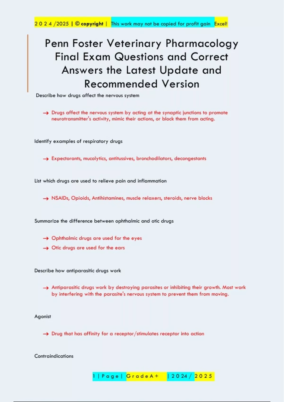 Penn Foster Veterinary Pharmacology Final Exam Questions and Correct Answers the Latest Update and Recommended Version