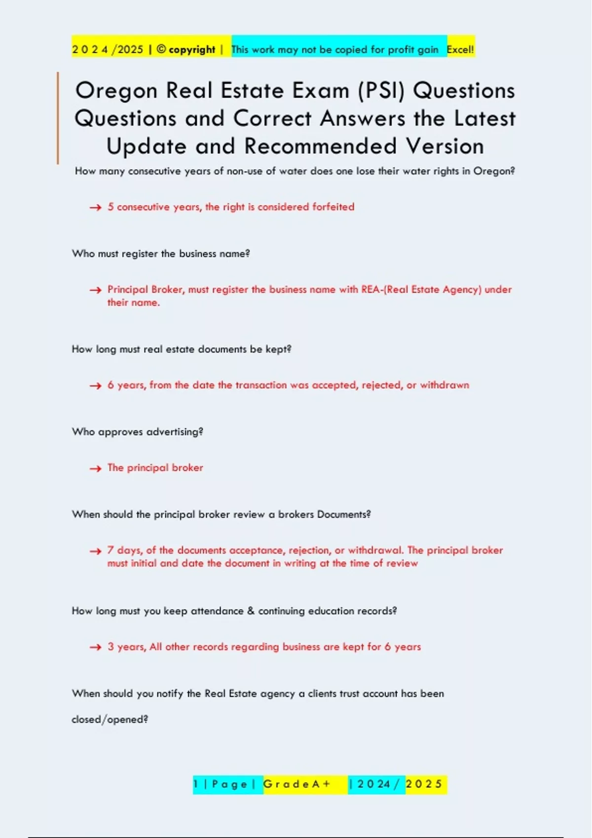 Oregon Real Estate Exam (PSI) Questions Questions and Correct Answers the Latest Update and Recommended Version