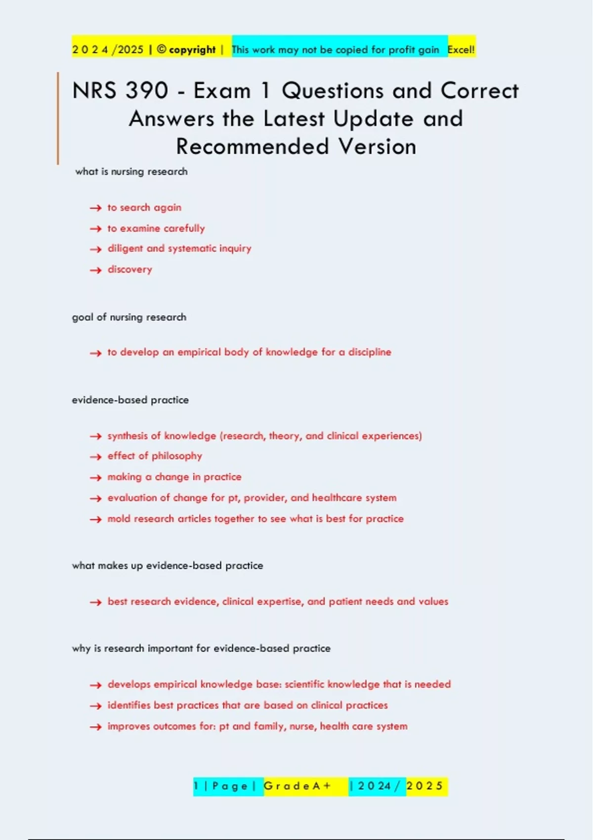NRS 390 - Exam 1 Questions and Correct Answers the Latest Update and Recommended Version