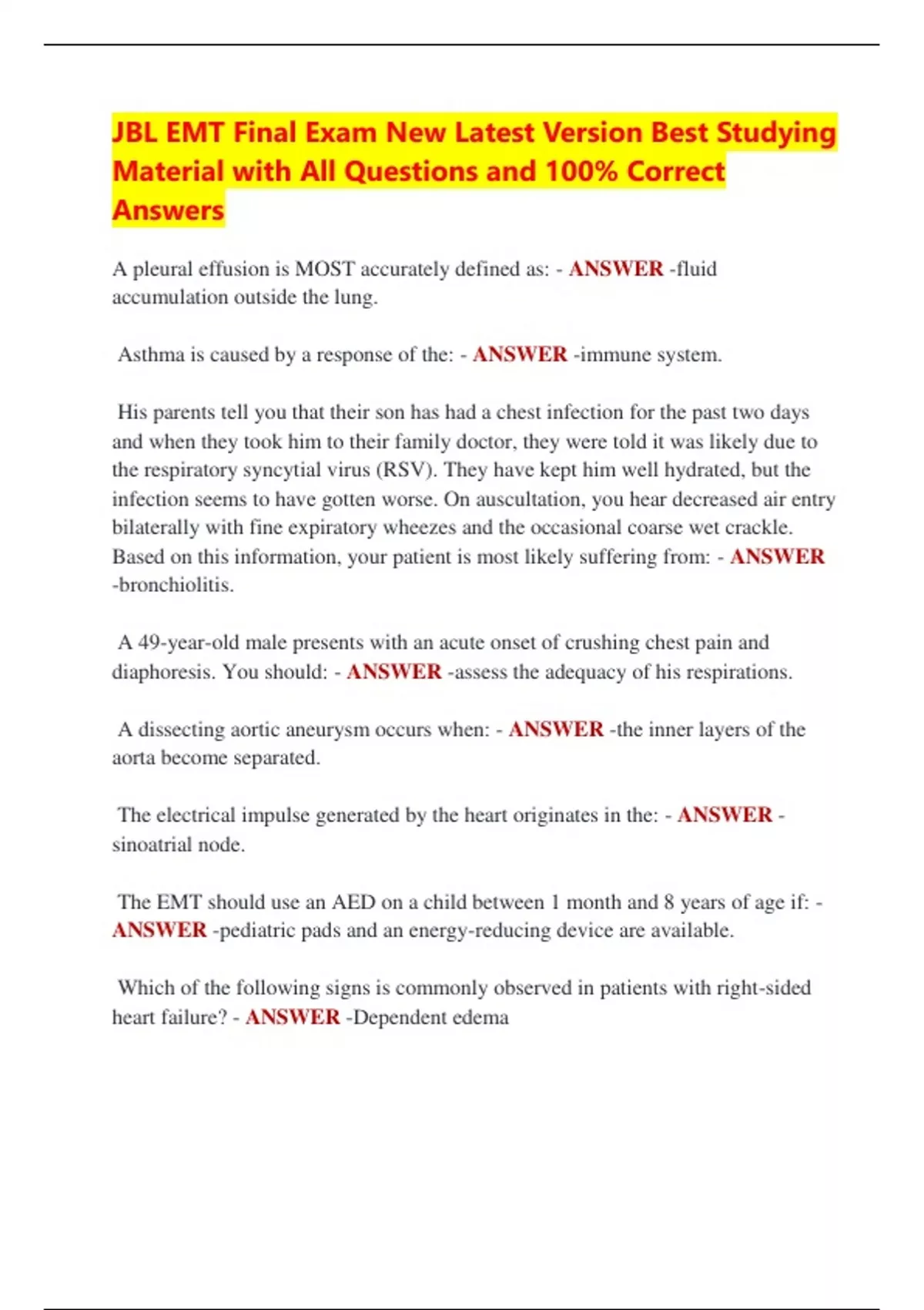 JBL EMT FINAL EXAM BUNDLE| Questions And Well Elaborated Solutions | LATEST UPDATES