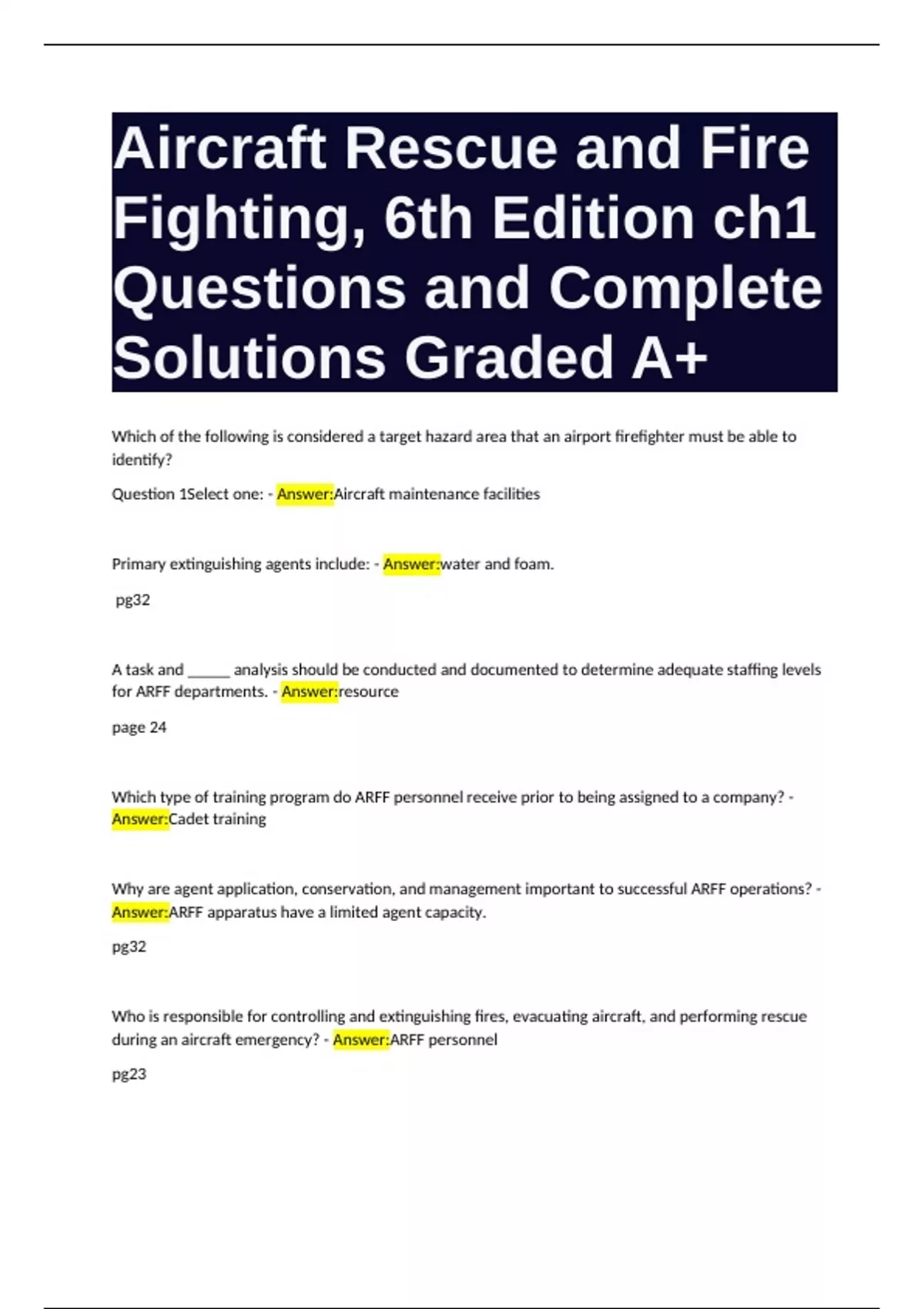 ARFF IFSTA 6th Ed Ch 10 Exam Questions and Complete Solutions Graded A Package Deal