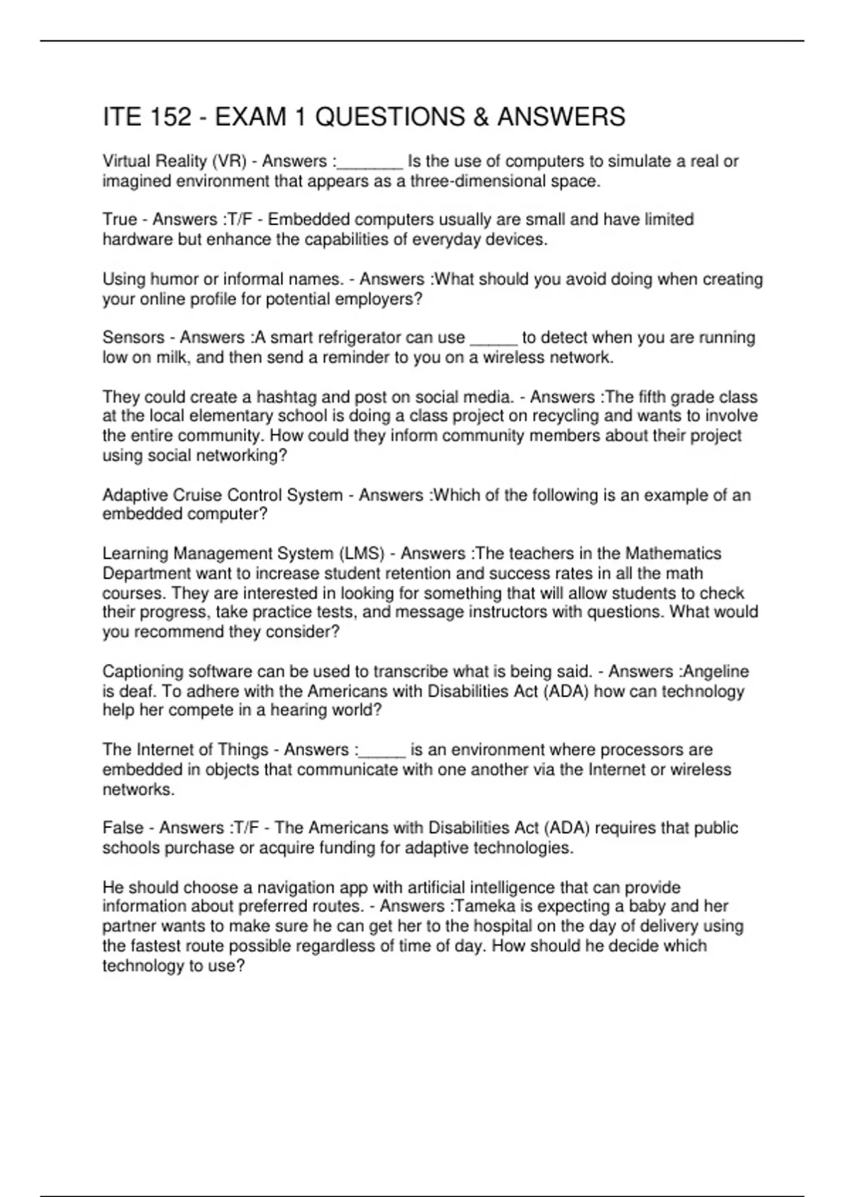 ITE 152 - EXAM 1 QUESTIONS & ANSWERS 2 Exam (elaborations) ITE 152 - EXAM 1 QUESTIONS AND ANSWERS 3 Exam (elaborations) ITE 152- EXAM 1 (CHAPTERS 1, 3, 5) QUESTIONS AND ANSWERS 4 Exam (elaborations) ITE 152- EXAM 2 QUESTIONS AND ANSWERS 5 Exam (elaborations) ITE 152 MODULES 9-12 QUIZ QUESTIONS 6 Exam (elaborations) ITE 152 QUIZ QUESTION AND AN