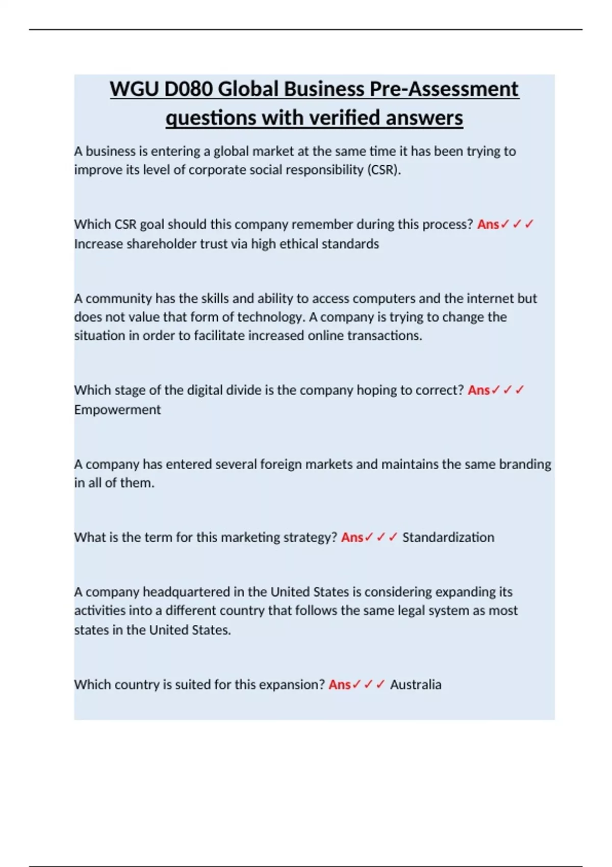 WGU D080 Managing in a Global Business Environment Tests Bundle Set