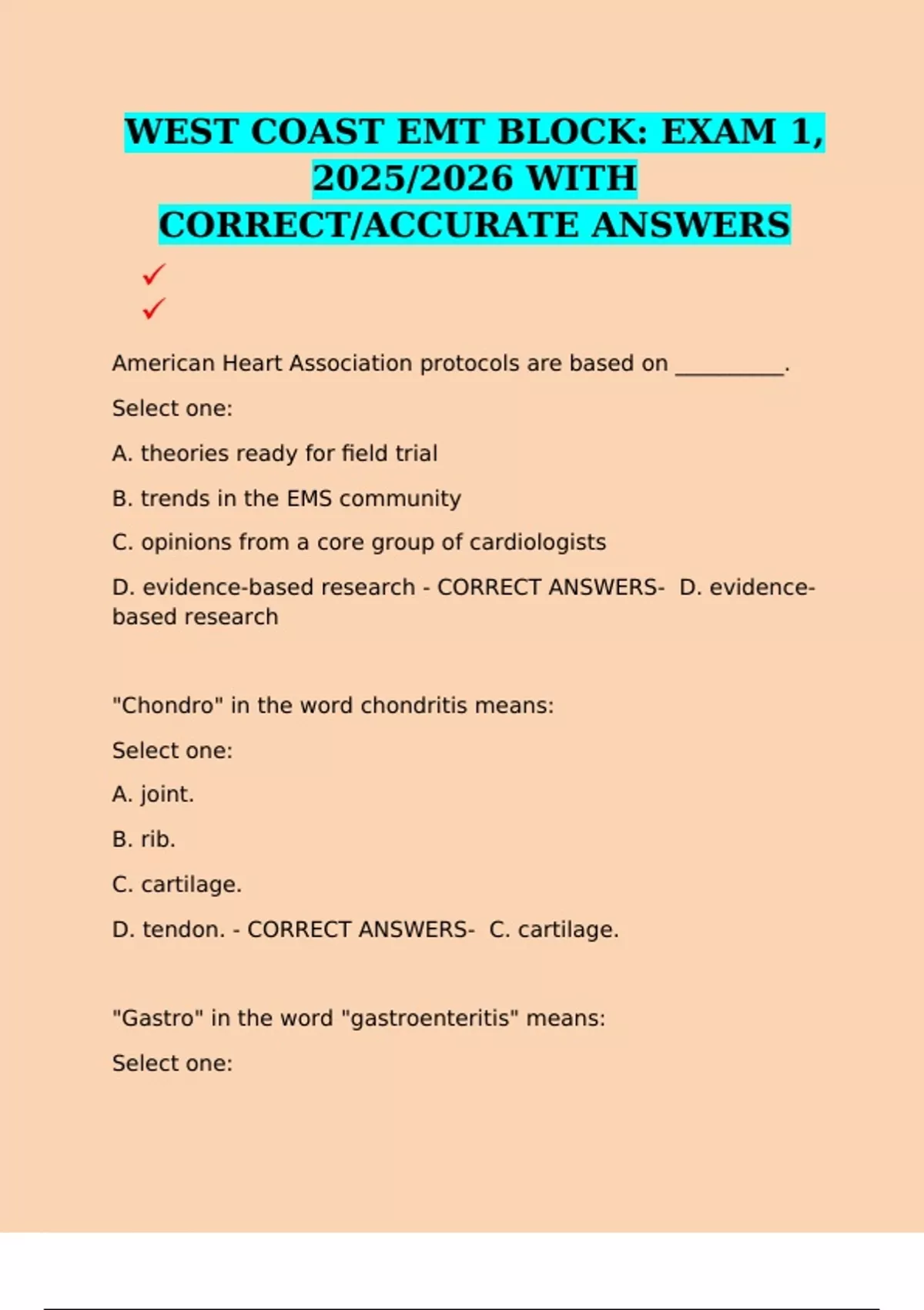 WEST COAST EMT BLOCK 2: EXAM, 2025/2026 WITH CORRECT/ACCURATE ANSWERS BLOCK 1 EXAM: WEST COAST EMT BLOCK 1, 2025/2026 WITH CORRECT/ACCURATE ANSWERS BLOCK 2 EXAM: WEST COAST EMT BLOCK 2, 2025/2026 WITH CORRECT/ACCURATE ANSWERS BLOCK 4 EXAM: WEST COAST EMT BLOCK 4, 2025/2026 WITH CORRECT/ACCURATE ANSWERS BLOCK EXAM 3: WEST COAST EMT BLOCK 3, 2025/202