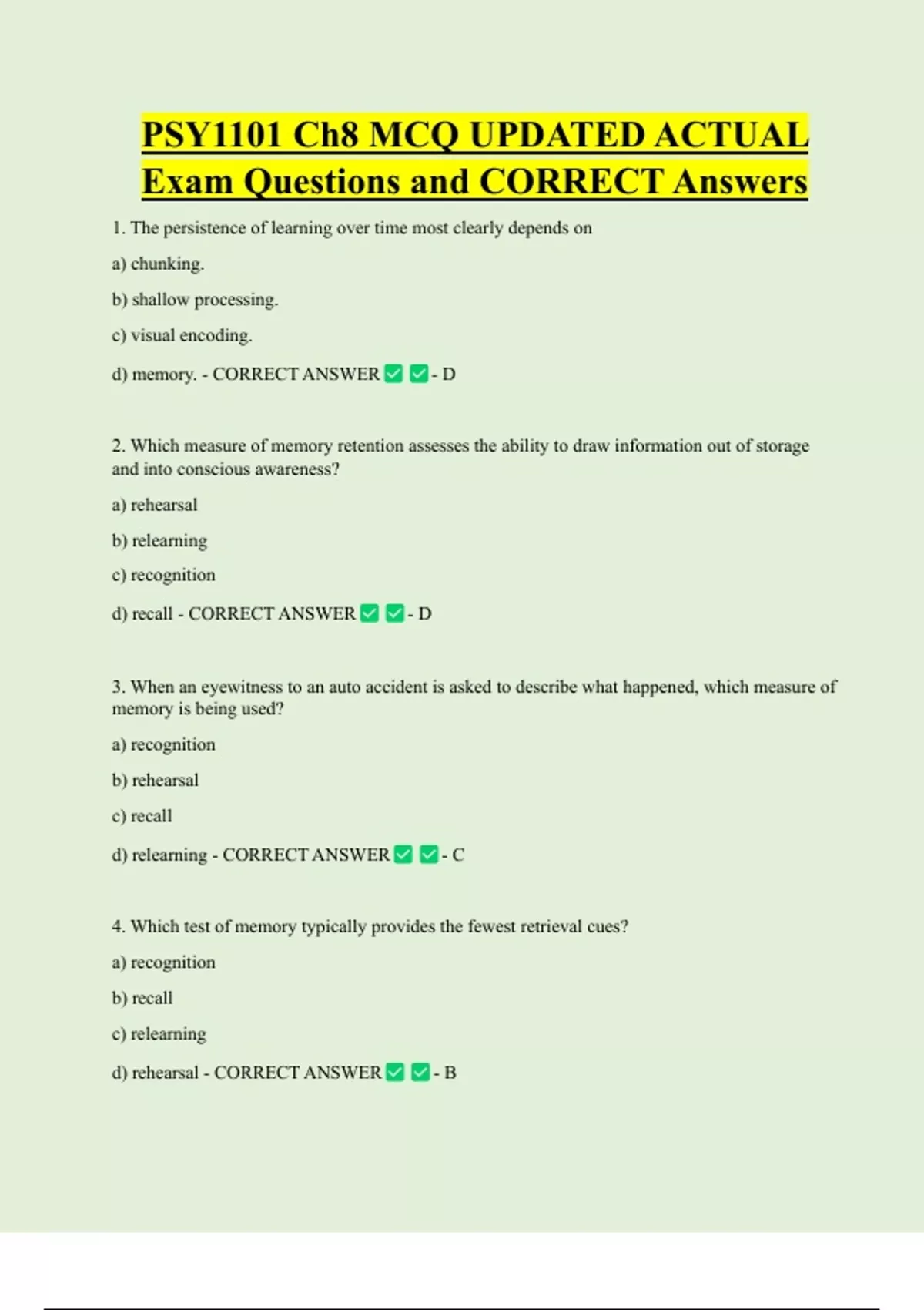 PSY1101 Bundled Exam Questions WITH CORRECT Answers