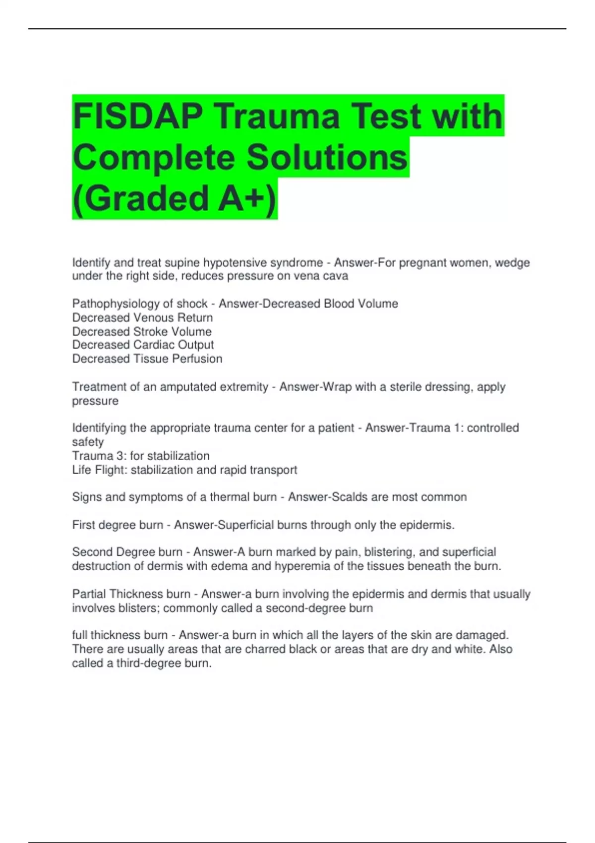 FISDAP Trauma Test with Complete Solutions (Graded A+) 2 Exam (elaborations) FISDAP TRAUMA EXAM QUESTIONS WITH 100% CORRECT ANSWERS 3 Exam (elaborations) FISDAP TRAUMA EXAM QUESTIONS WITH REVISED ANSWERS ALL CORRECT 4 Exam (elaborations) FISDAP Trauma Study Test Questions with All Correct Answers 5 Exam (elaborations) FISDAP TRAUMA 2025 EXAM QU