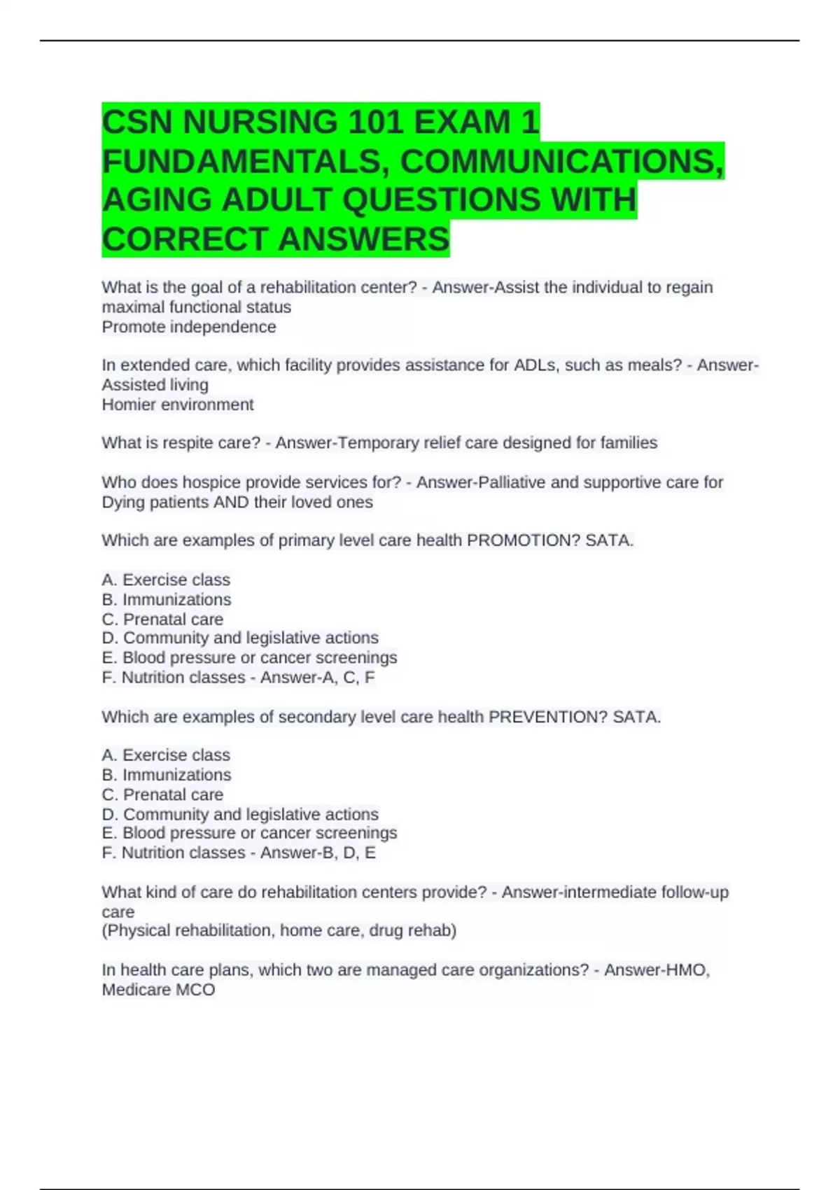 NUR 101 UNIT 1- HEALTH EXAM QUESTIONS AND ANSWERS