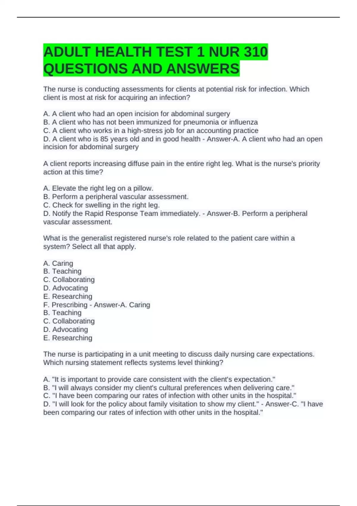 ADULT HEALTH TEST 1 NUR 310 QUESTIONS AND ANSWERS