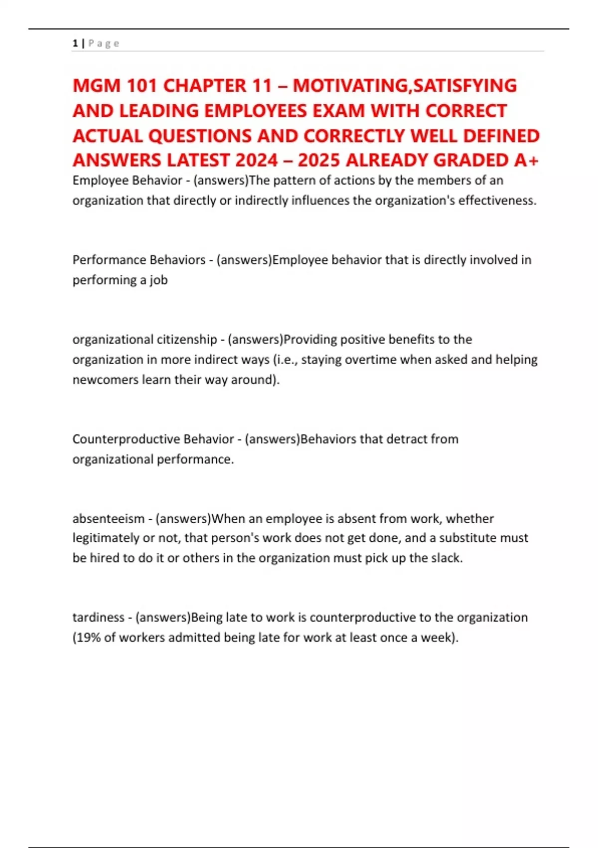 MGM 101 CHAPTER 11 – MOTIVATING,SATISFYING AND LEADING EMPLOYEES EXAM WITH CORRECT ACTUAL QUESTIONS AND CORRECTLY WELL DEFINED ANSWERS LATEST 2024 – 2025 ALREADY GRADED A+