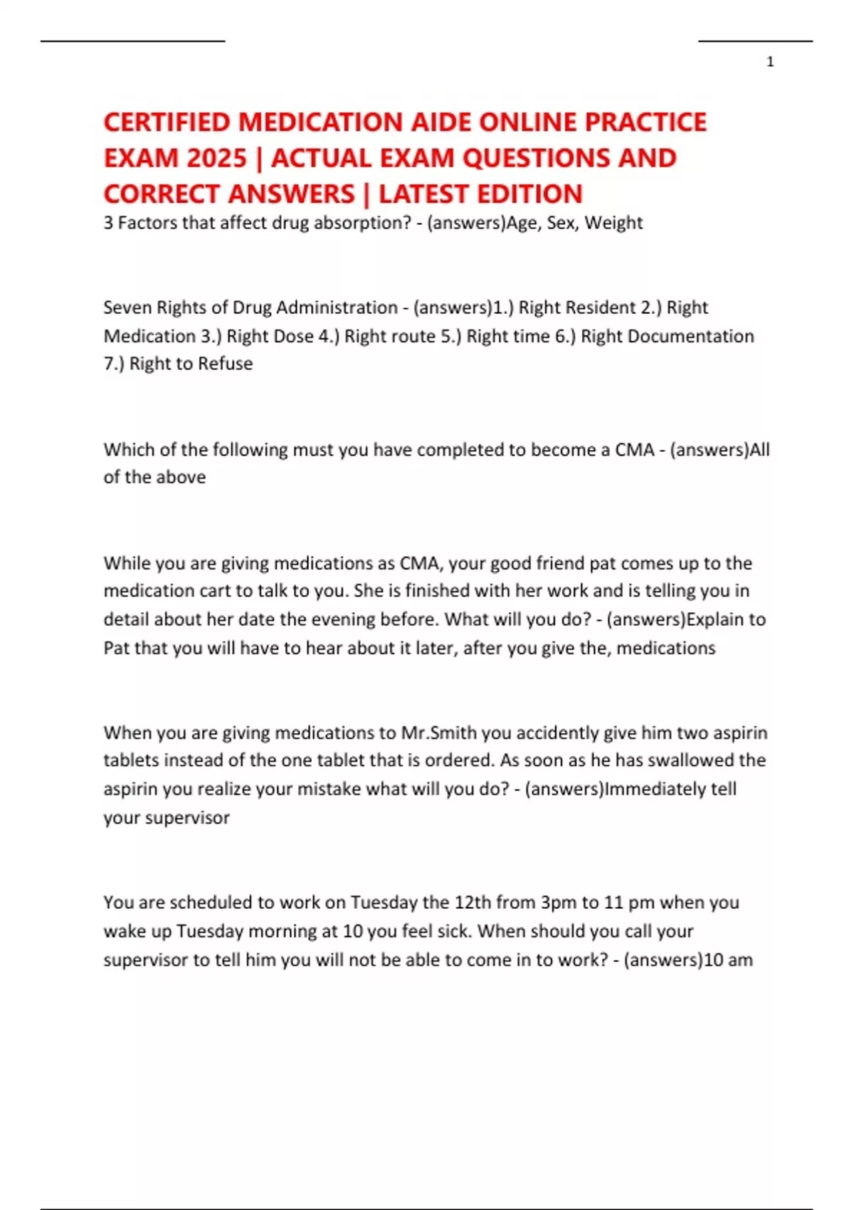 CERTIFIED MEDICATION AIDE ONLINE PRACTICE EXAM 2025 | ACTUAL EXAM QUESTIONS AND CORRECT ANSWERS | LATEST EDITION
