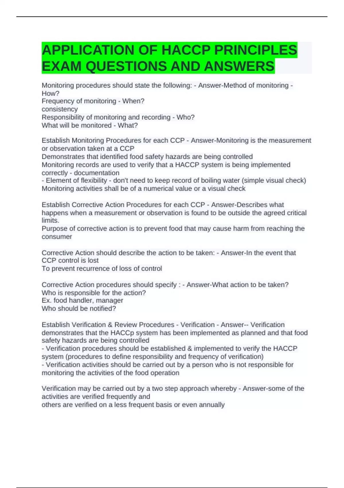 HACCP EXAM REVIEW QUESTIONS WITH COMPLETE ANSWERS 2 Exam (elaborations) HACCP EXAM SET QUESTIONS WITH COMPLETE ANSWERS 3 Exam (elaborations) HACCP EXAM SET QUESTIONS WITH COMPLETE ANSWERS 4 Exam (elaborations) HACCP FINAL PRACTICE EXAM REVIEW QUESTIONS WITH CORRECT ANSWERS 5 Exam (elaborations) HACCP FINAL EXAM QUESTIONS WITH CORRECT ANSWERS- G