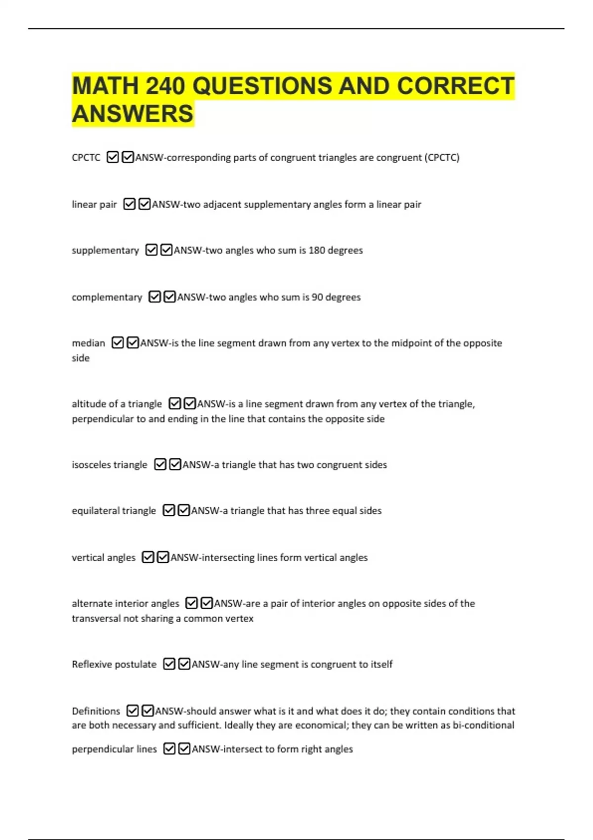 Exam (elaborations) MATH 240 QUESTIONS AND CORRECT ANSWERS 2 Exam (elaborations) MATH 240 SECTIONS 2.1-2.3, 2.6, 3.1 3.3, 4.1-4.3, 4.5 QUESTIONS AND CORRECT ANSWERS 3 Exam (elaborations) MATH 240 MIDTERM 1 QUESTIONS AND CORRECT ANSWERS 4 Exam (elaborations) MATH 240 QUIZ 2 AND CORRECT ANSWERS 5 Exam (elaborations) MATH 240: EXAM 3 QUESTIONS AN