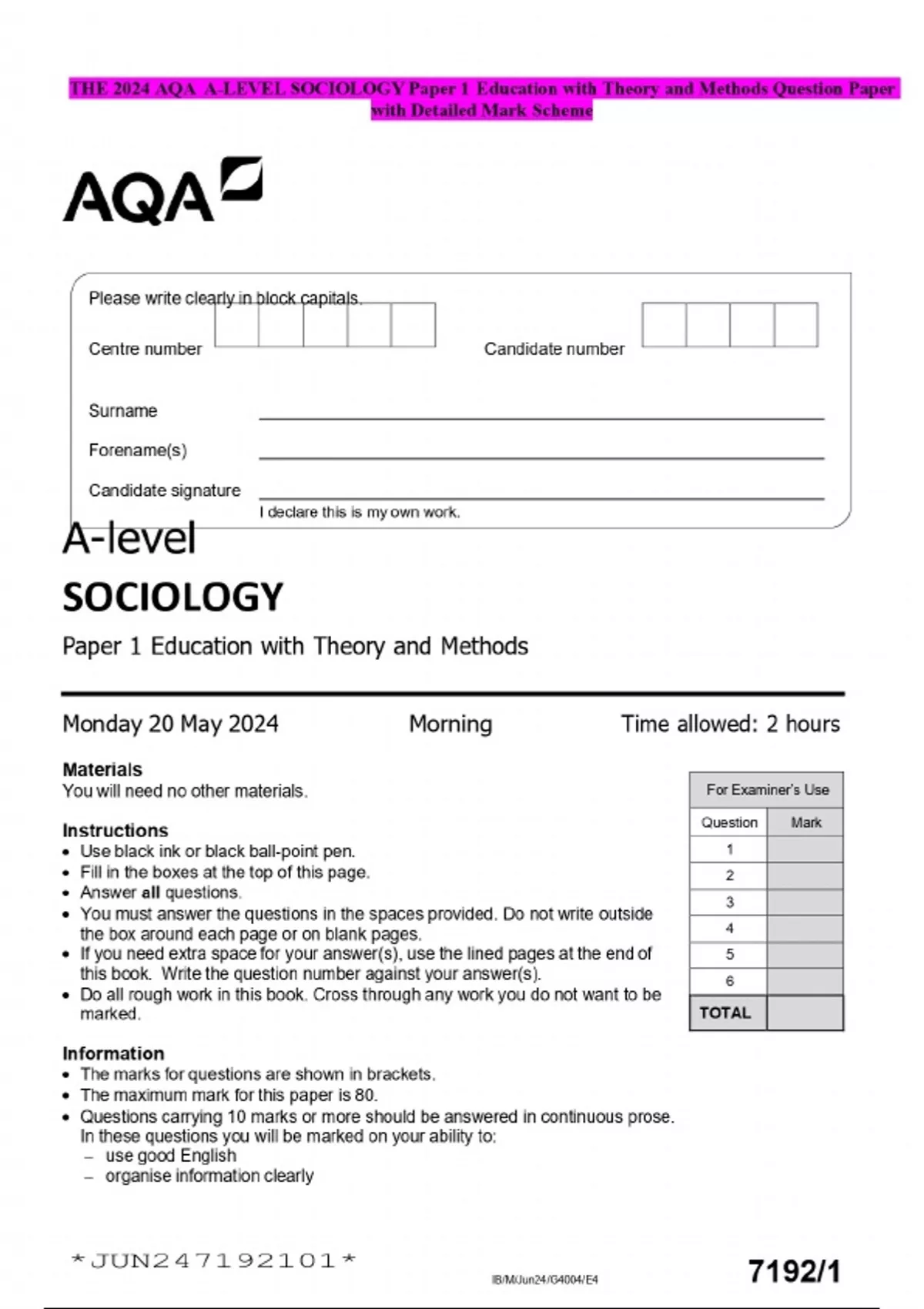 THE 2024 AQA A-LEVEL SOCIOLOGY Paper 1 Education with Theory and Methods Question Paper with Detailed Mark Scheme