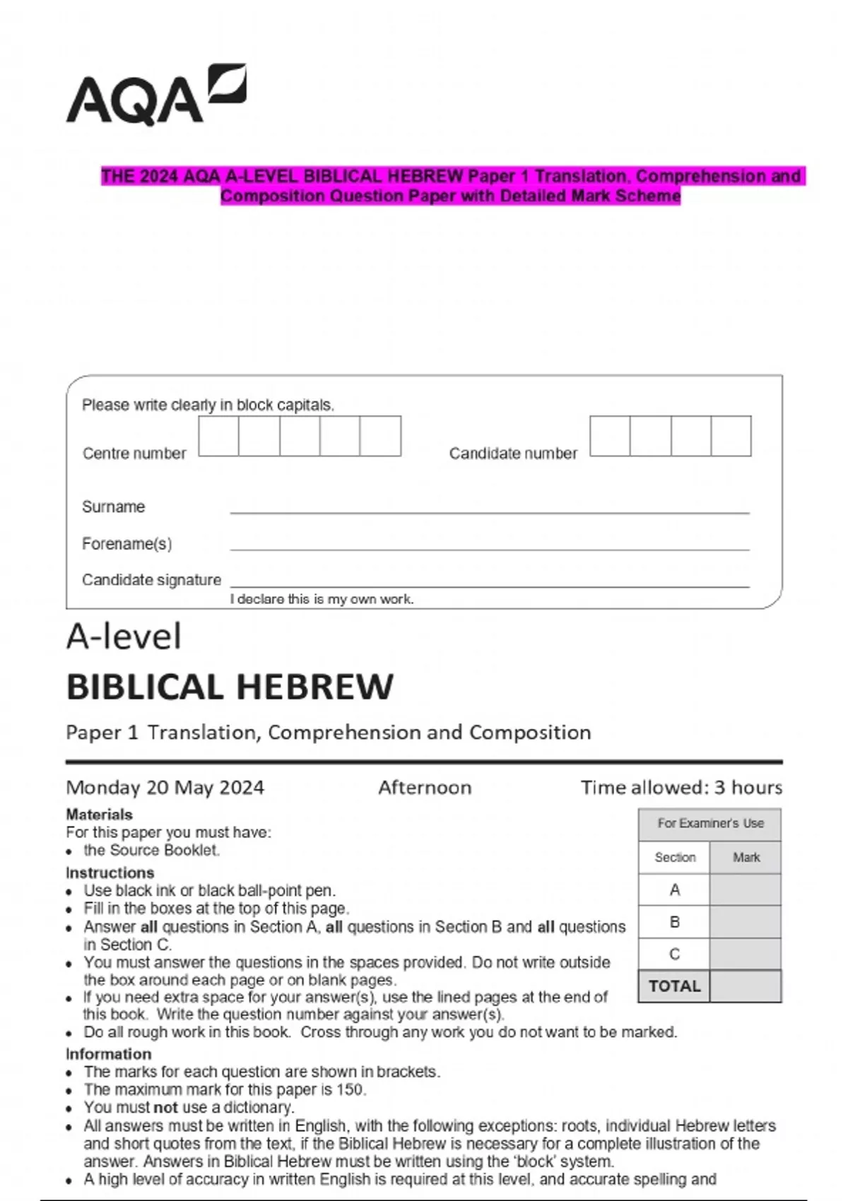 THE 2024 AQA A-LEVEL BIBLICAL HEBREW Paper 1 Translation, Comprehension and Composition Question Paper with Detailed Mark Scheme
