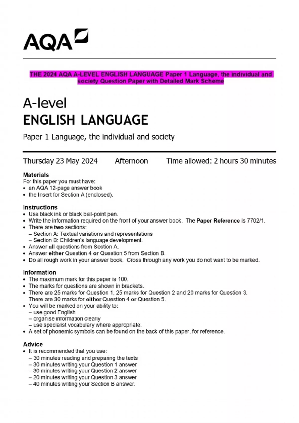 THE 2024 AQA A-LEVEL ENGLISH LANGUAGE Language, the individual and society Question Paper with Detailed Mark Scheme