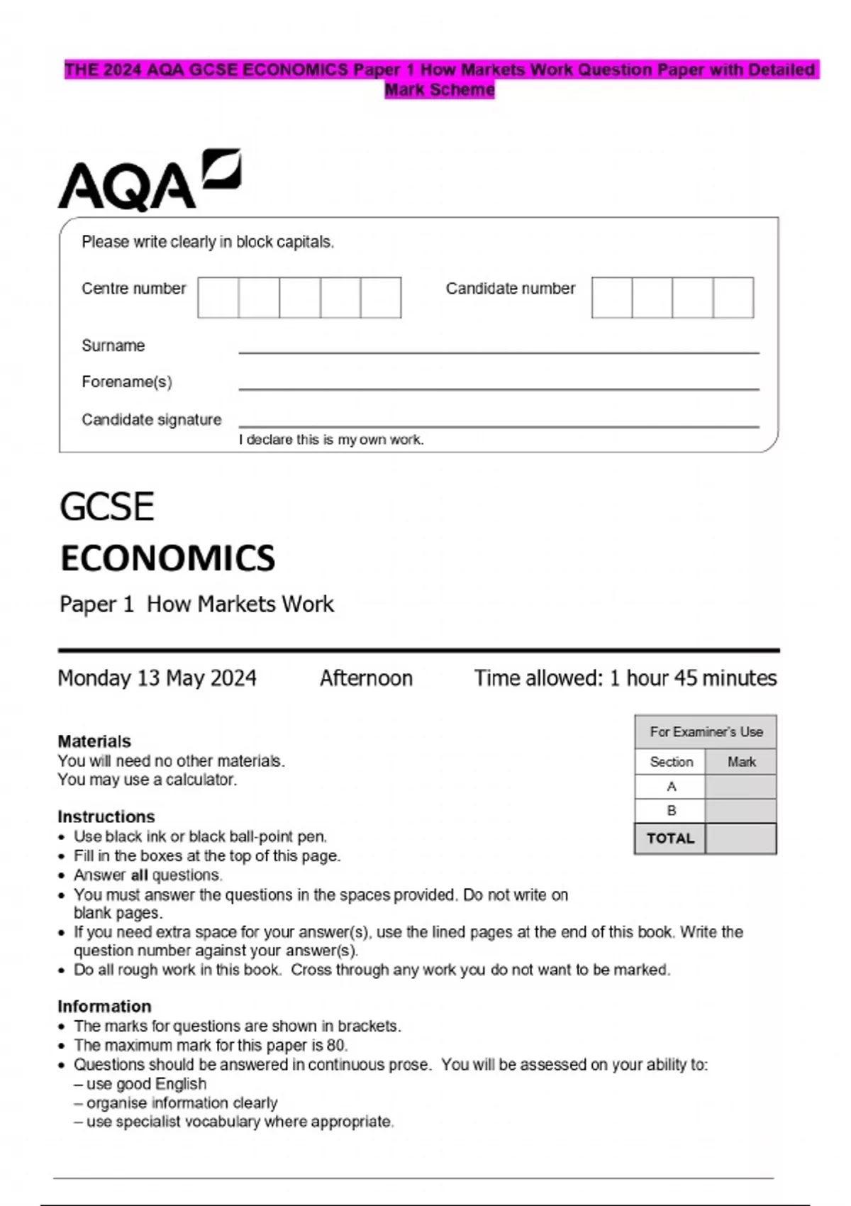 THE 2024 AQA GCSE ECONOMICS How Markets Work Question Paper with Detailed Mark Scheme