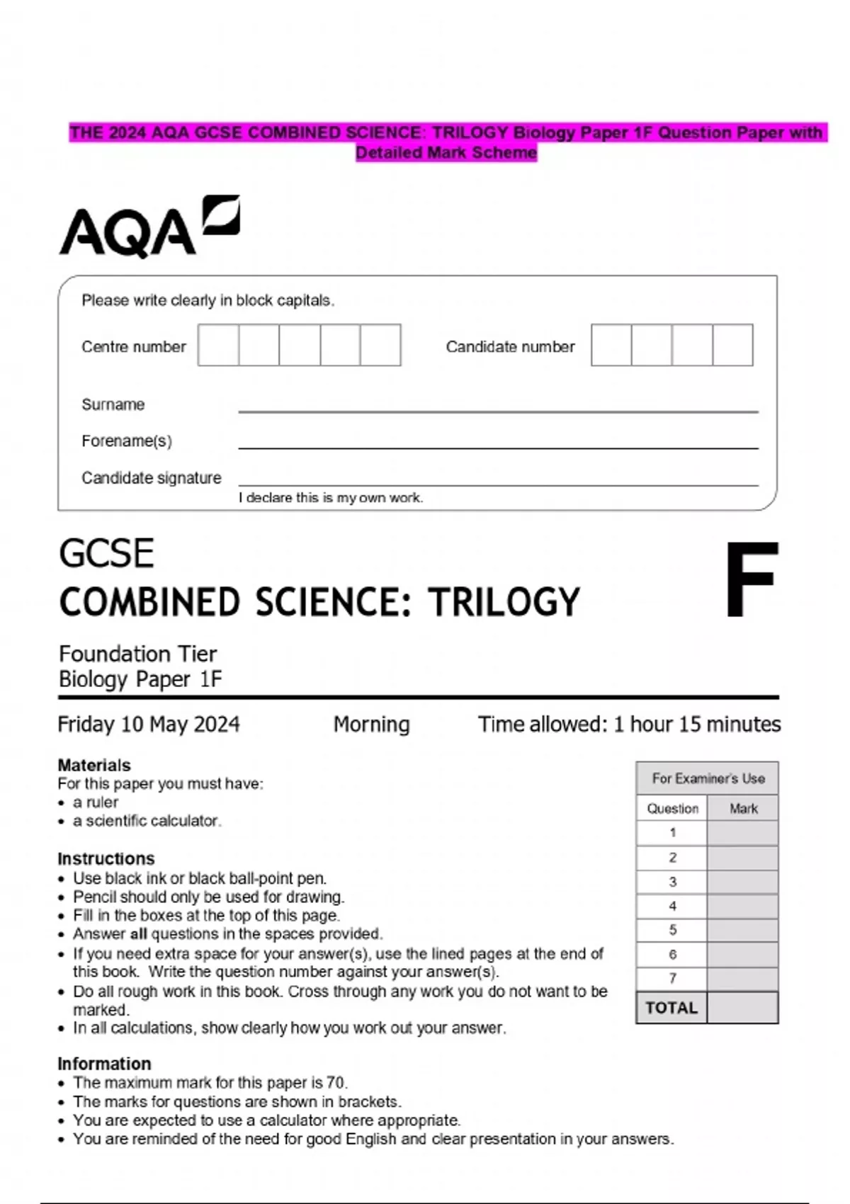 THE 2024 AQA GCSE COMBINED SCIENCE: TRILOGY Biology Paper 1F Question Paper with Detailed Mark Scheme