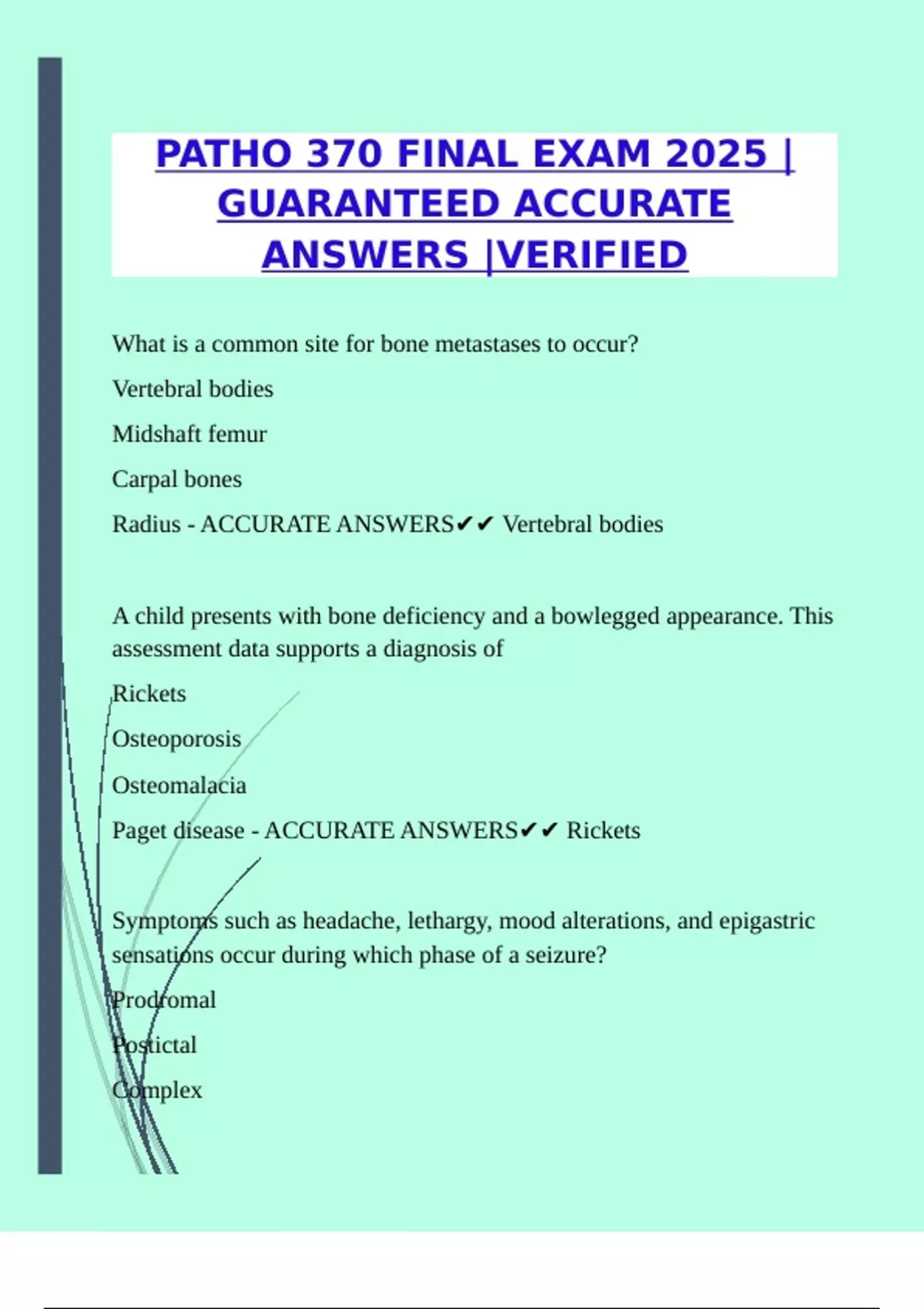 PATHO 370 MIDTERM EXAM 2025 |GUARANTEED ACCURATE ANSWERS WCU PATHOPHYSIOLOGY 370 FINAL EXAM TEST |GUARANTEED PASS!! PATHO 370 FINAL EXAM |GUARANTEED ACCURATE ANSWERS |COMPLETE PATHO 370 FINAL EXAM 2025 |GUARANTEED ACCURATE ANSWERS |VERIFIED PATH 370 MIDTERM EXAM |GUARANTEED ACCURATE ANSWERS