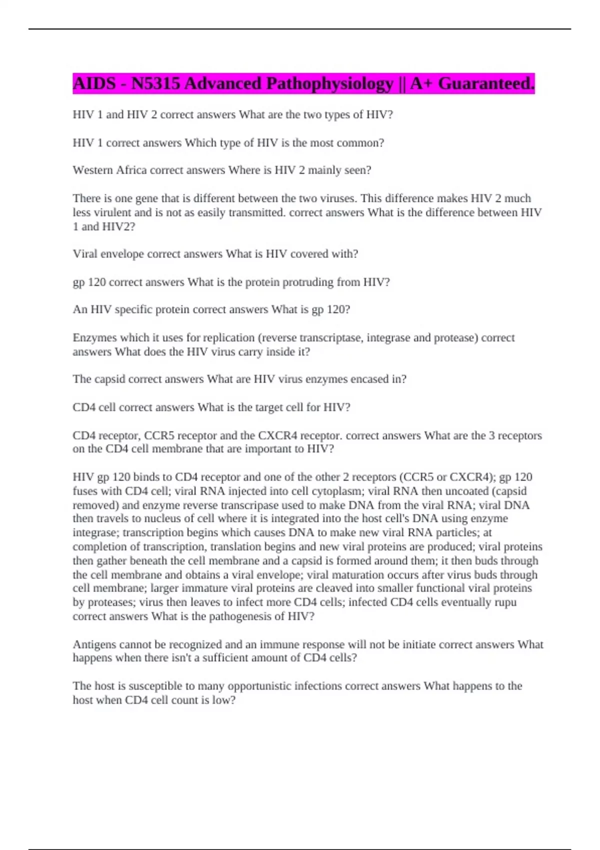 AIDS - N5315 Advanced Pathophysiology || A+ Guaranteed. NURS 5315: Exam 5 Concept and Clinical Condition (GI System) || with Error-free Solutions. Nurs 5315: Adv Patho Exam 1 || with 100% Error-free Answers. Nurs 5315 UTA exam 1 || A Verified A+ Pass. N5315 Inflammation, Immunity, Infection || (Needed to Pass) Confirmed A+. N5315 Inflammation, Immu
