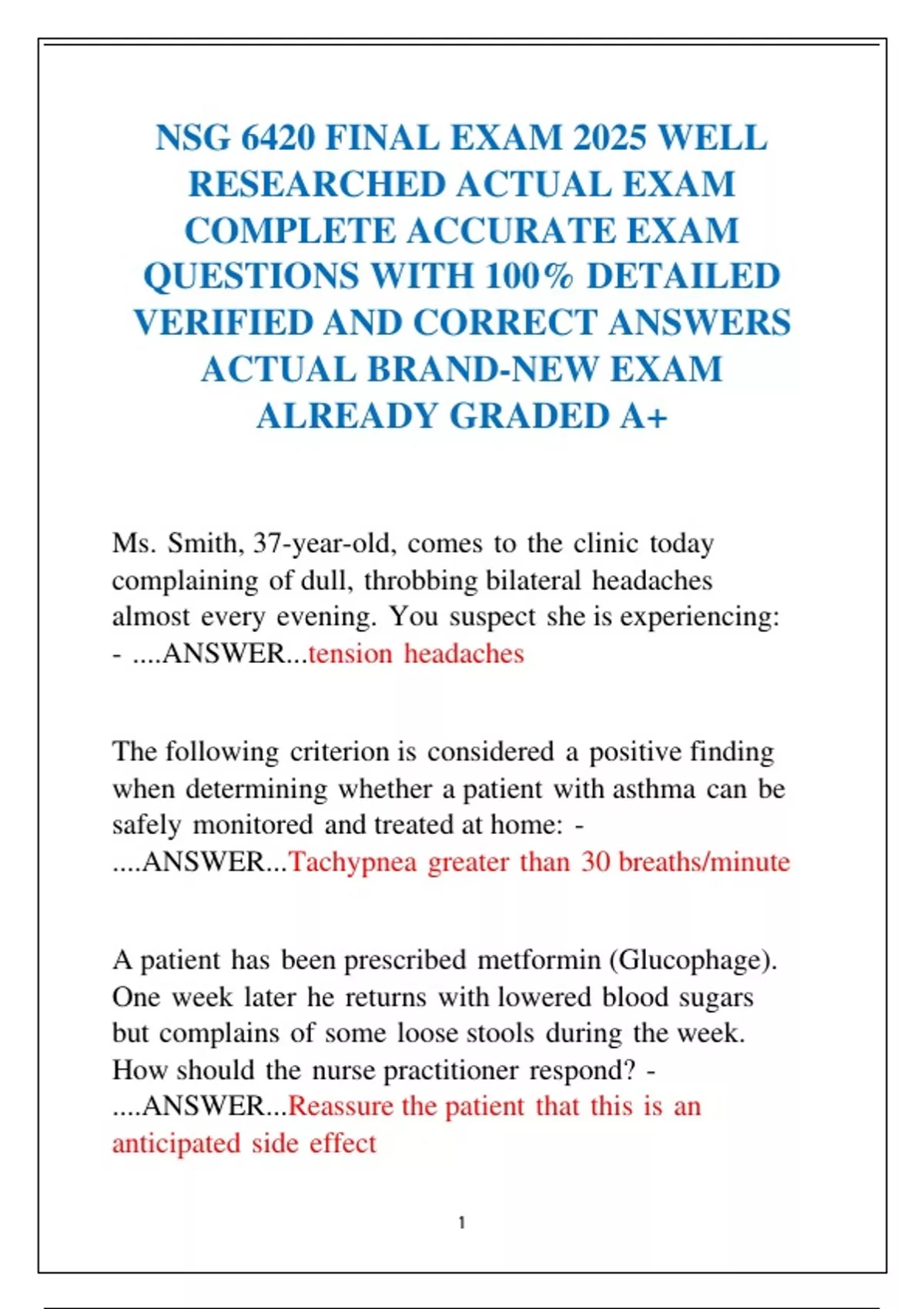 Tailor made study materials for nursing, accounting mathematics and computer science with reputable guarantee for success graded A+. I offer expertly crafted study materials designed to help you excel in your academic journey. My resources are tailored to help you prepare for your exams and tackling your coursework You'll find high-quality, accurate, and up-to-date materials here. Explore my collection to find resources that will help you understand complex topics, improve your grades, and boost your confidence. For any questions or custom requests, feel free to reach out.Happy studying and best of luck!
