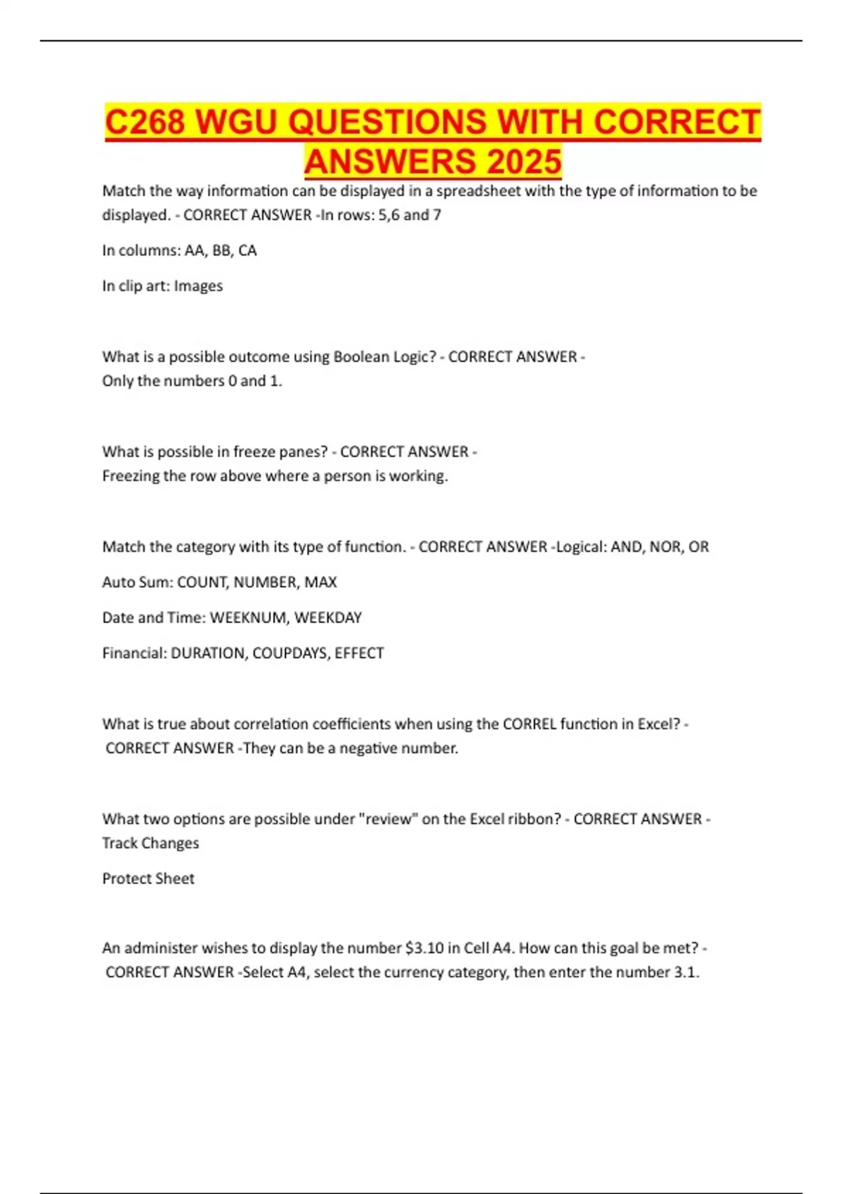 WGU C268 SPREADSHEETS QUESTIONS WITH CORRECT ANSWERS 2025