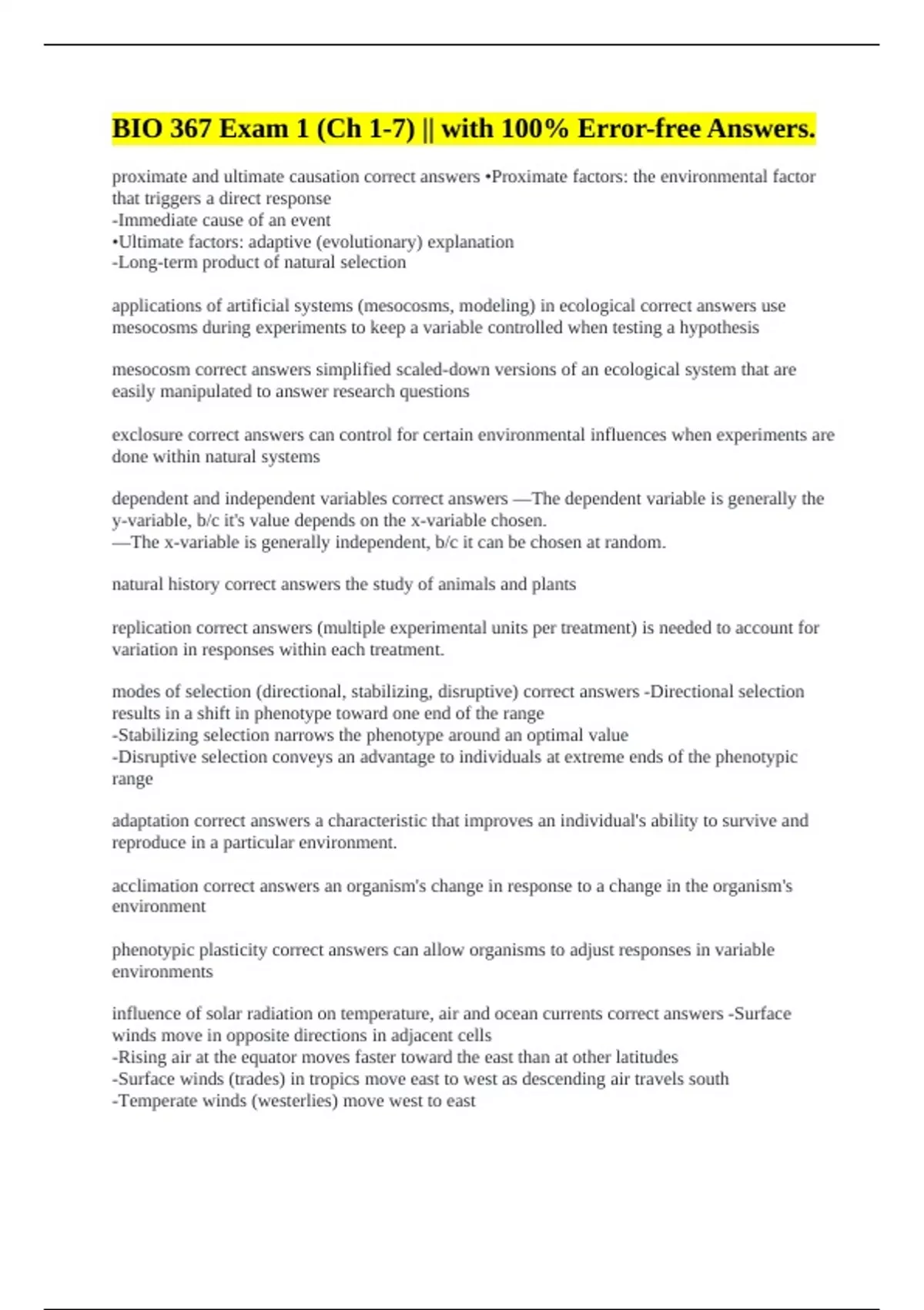 BIO 367 EXAM 4 || A+ Graded Already. BIOL 367: final || All Answers Are Correct 100%. BIOL 367 Exam 1 Practice Questions || with 100% Correct Answers. BIOL 367 Exam 1 || very Flawless. BIOL 367 || with 100% Errorless Answers. Biol 367 || All Questions Answered Correctly. Bio 367 Midterm || with A+ Guaranteed Solutions. BIO 367 Exam 1 (Ch 1-7) || wi